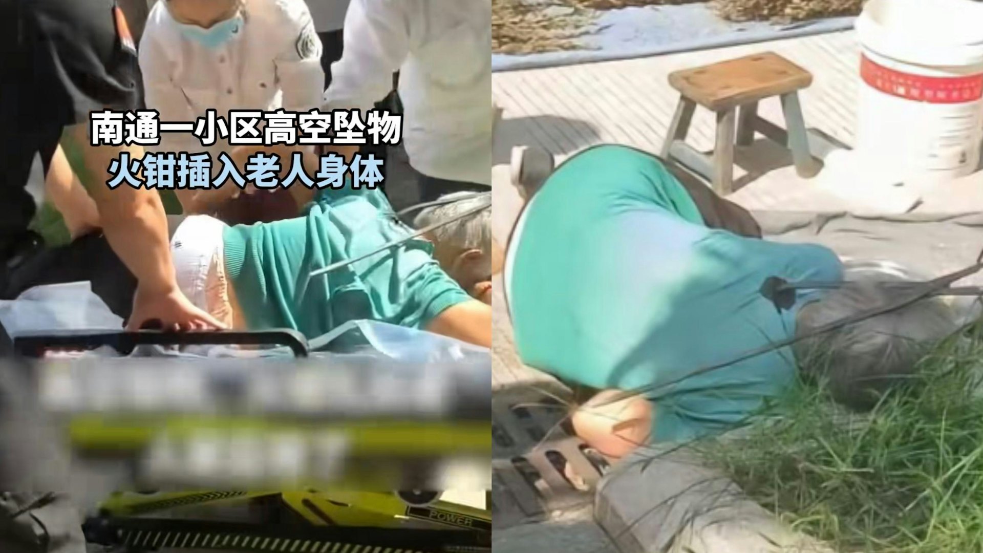 江蘇南通一老人被高空墜落火鉗扎傷去世。(影片截圖) Z$ q5 D$ S! p4 }3 V4 r- U