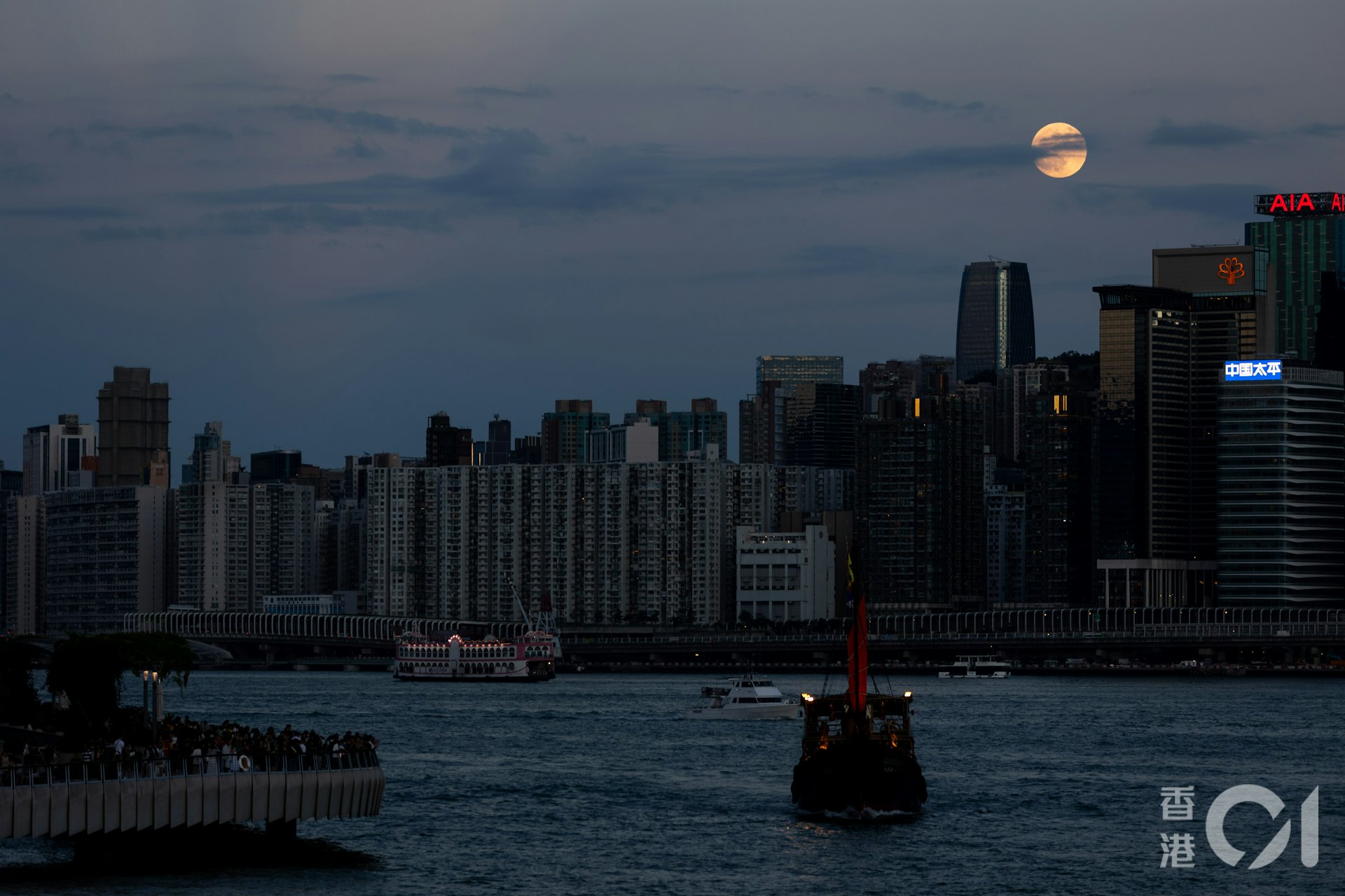 中秋節正日(17日),尖沙咀海濱亦能清楚欣賞到明月。(夏家朗攝)