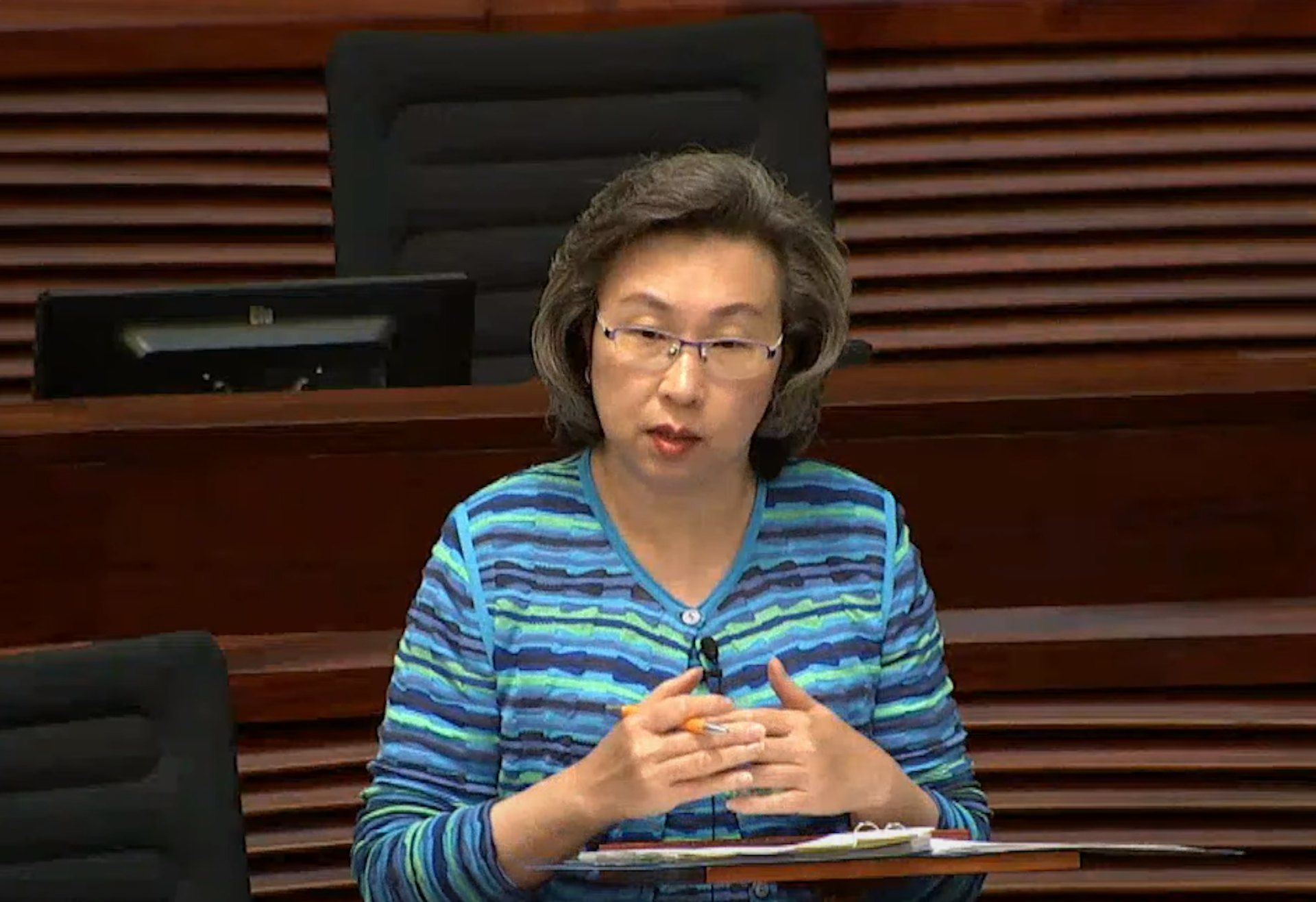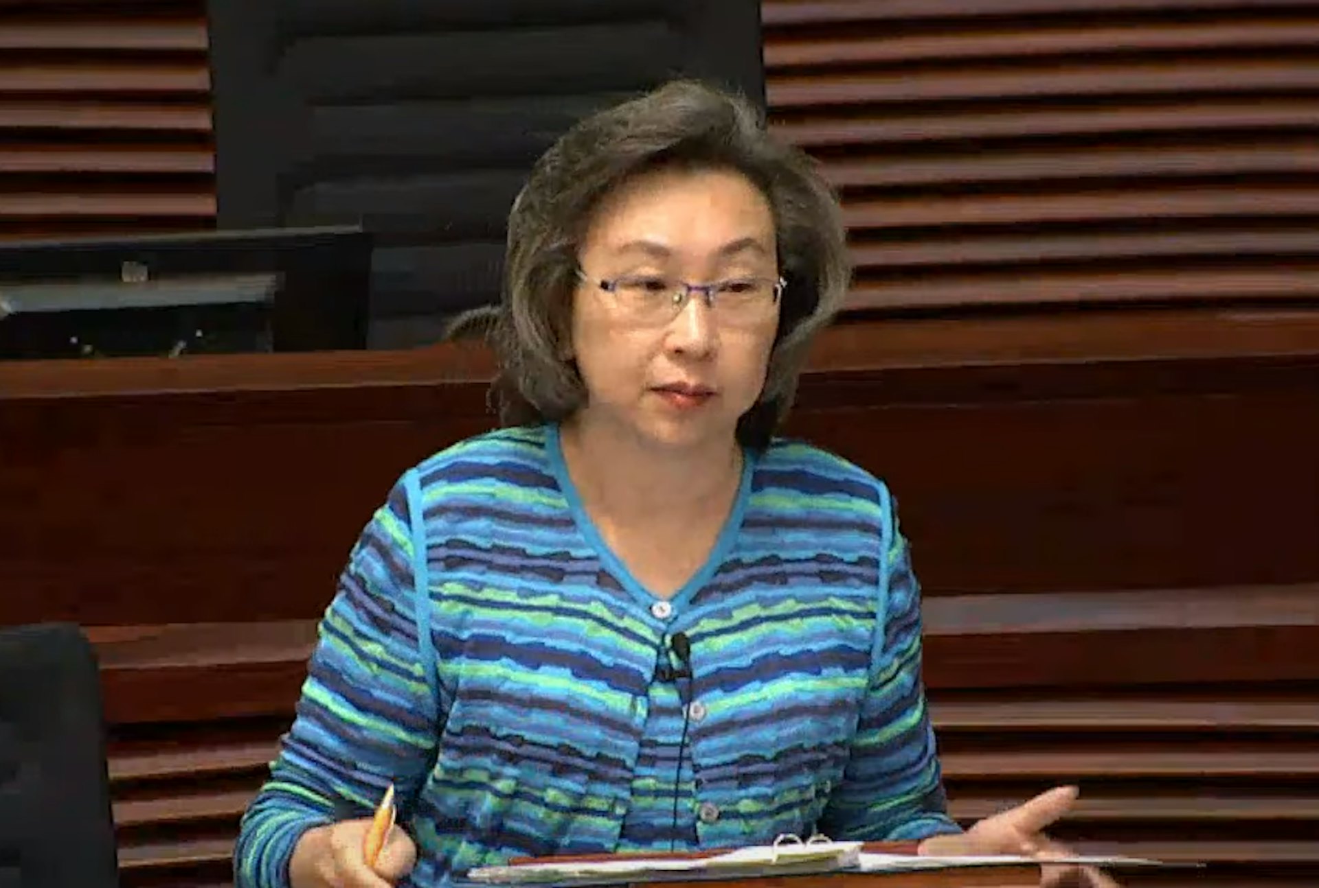 9 S0 p T7 v) J3 \: o& b5 W) N6 d$ T. S公仔箱論壇5月28日,公務員事務局局長楊何蓓茵出席立法會會議。(直播截圖)