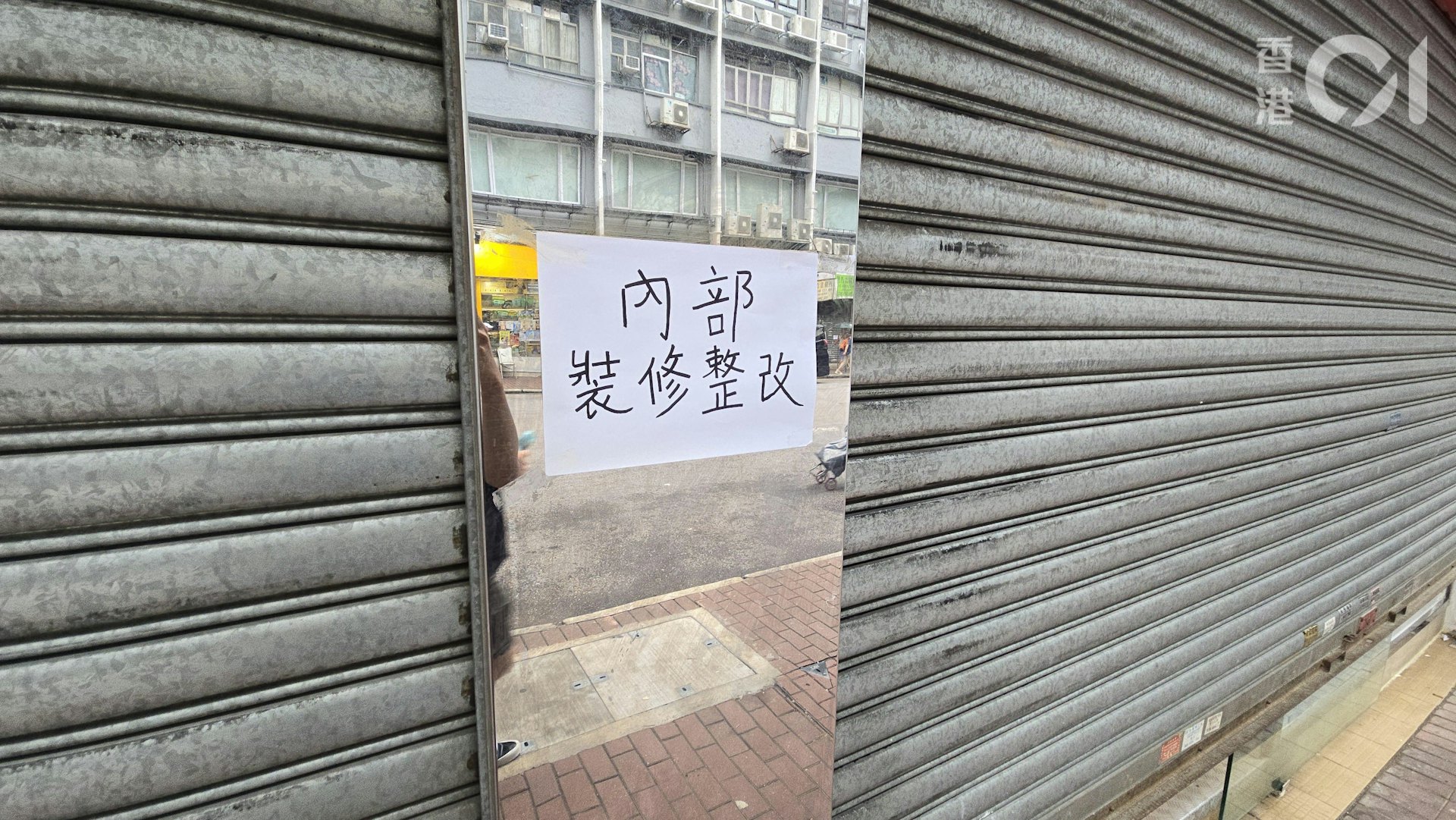 6 Q* _1 ]+ x4 E" U( U長沙灣「福哥茶記」8月3日仍然停業,外面柱上貼有「內部裝修整改」告示。(張智浩攝)