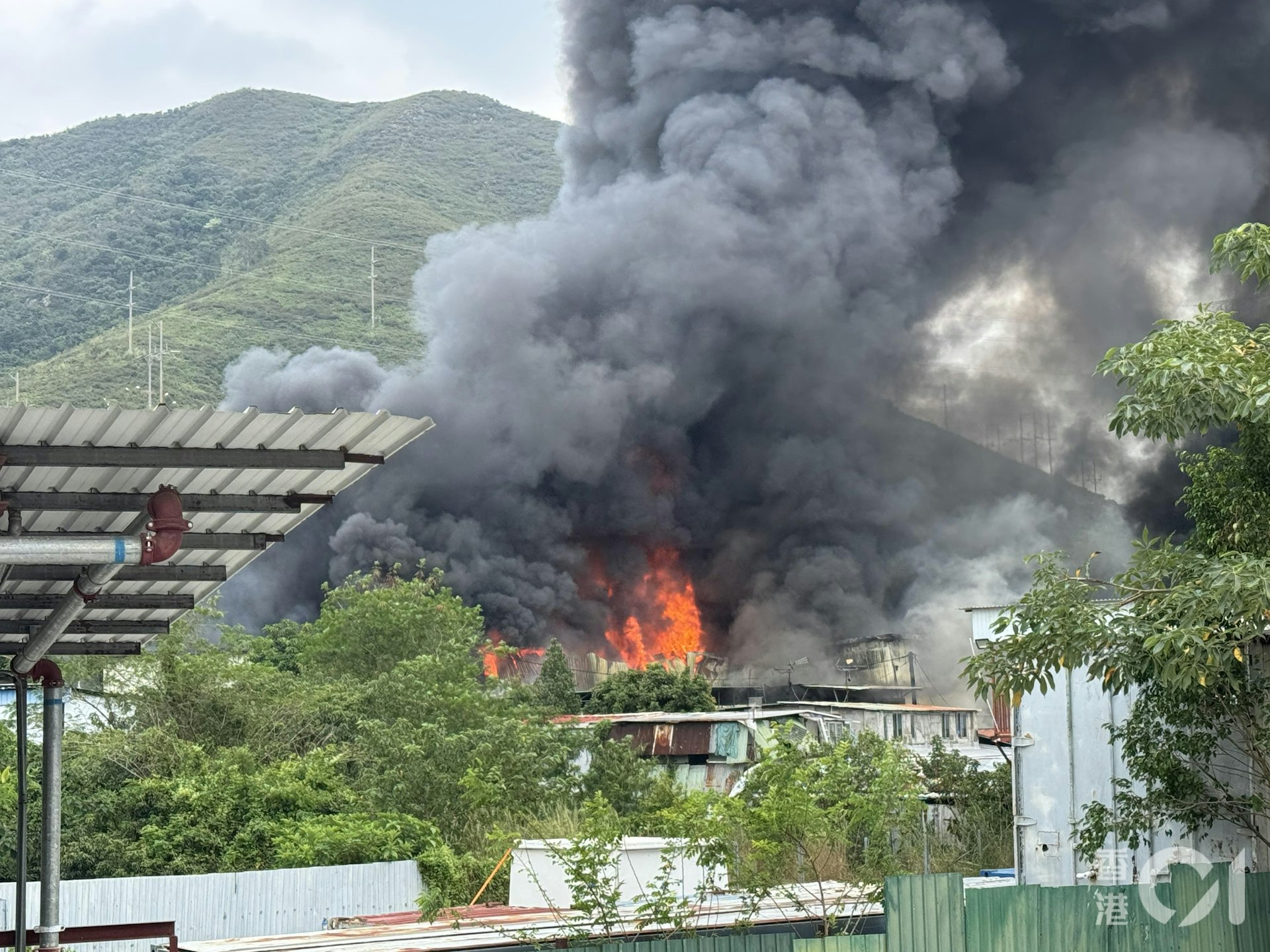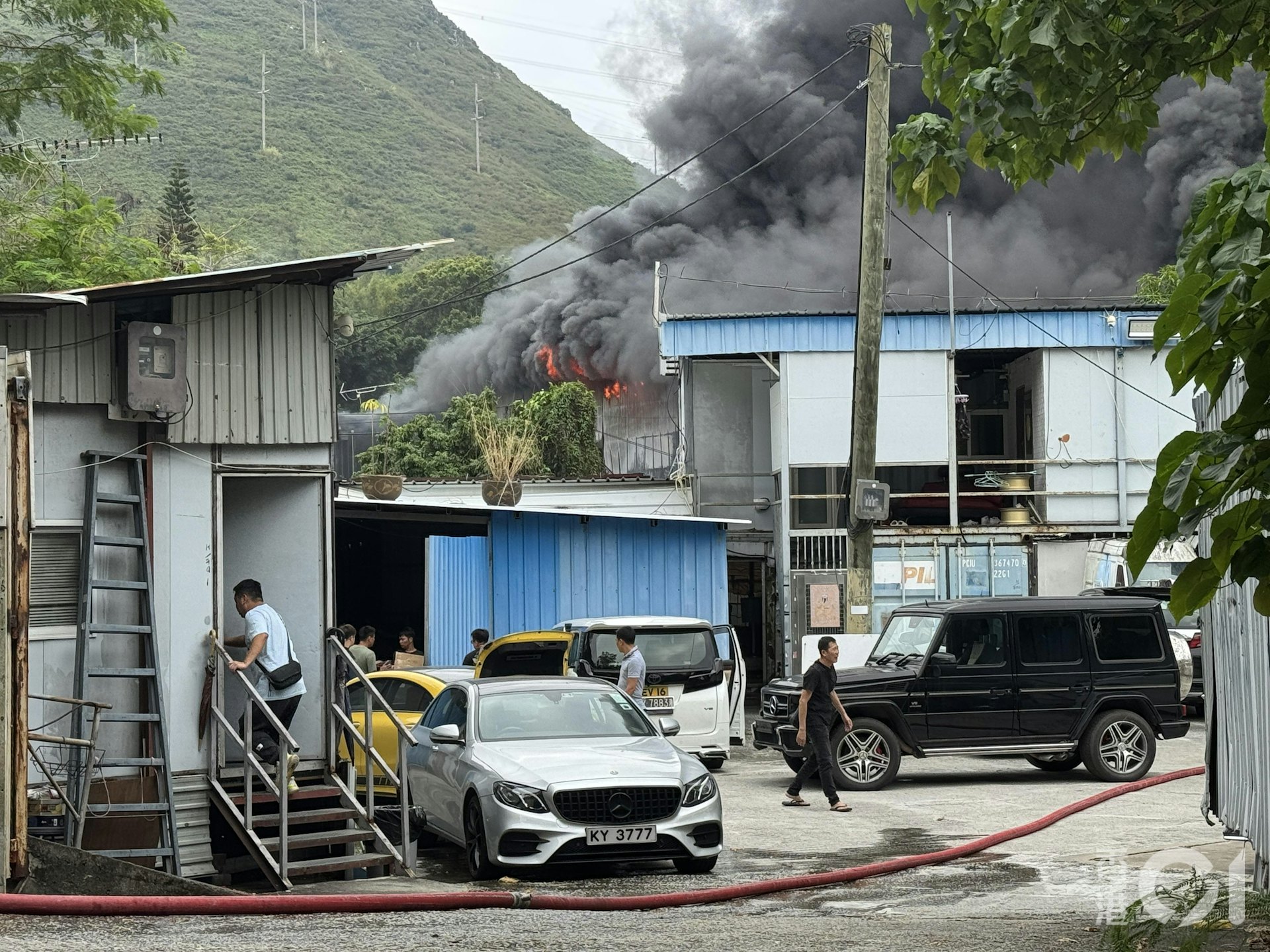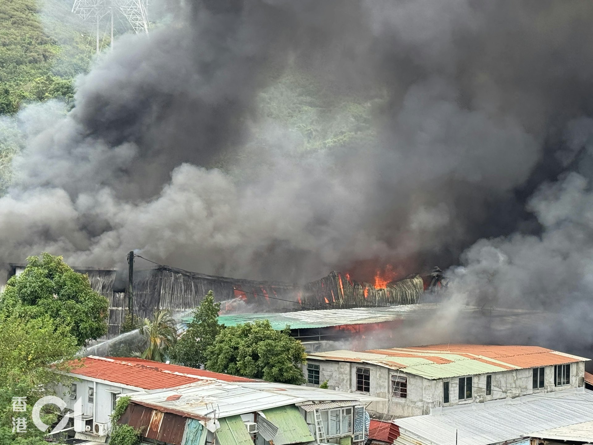 新田麒麟村一個貨倉發生三級火,火勢猛烈,更蔓延到相鄰的村屋。(蔡正邦攝): O- N9 ]: s8 e. F) C