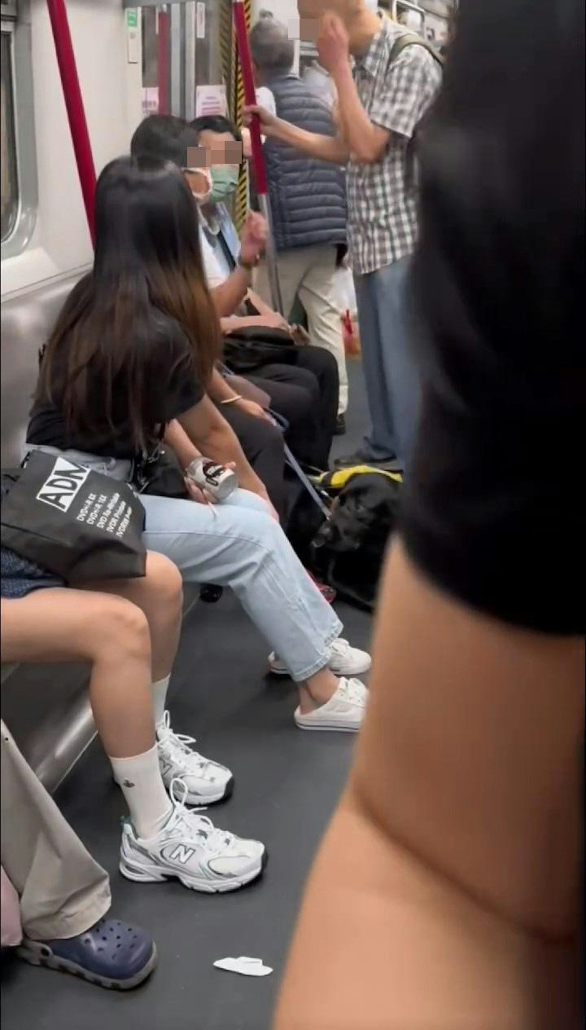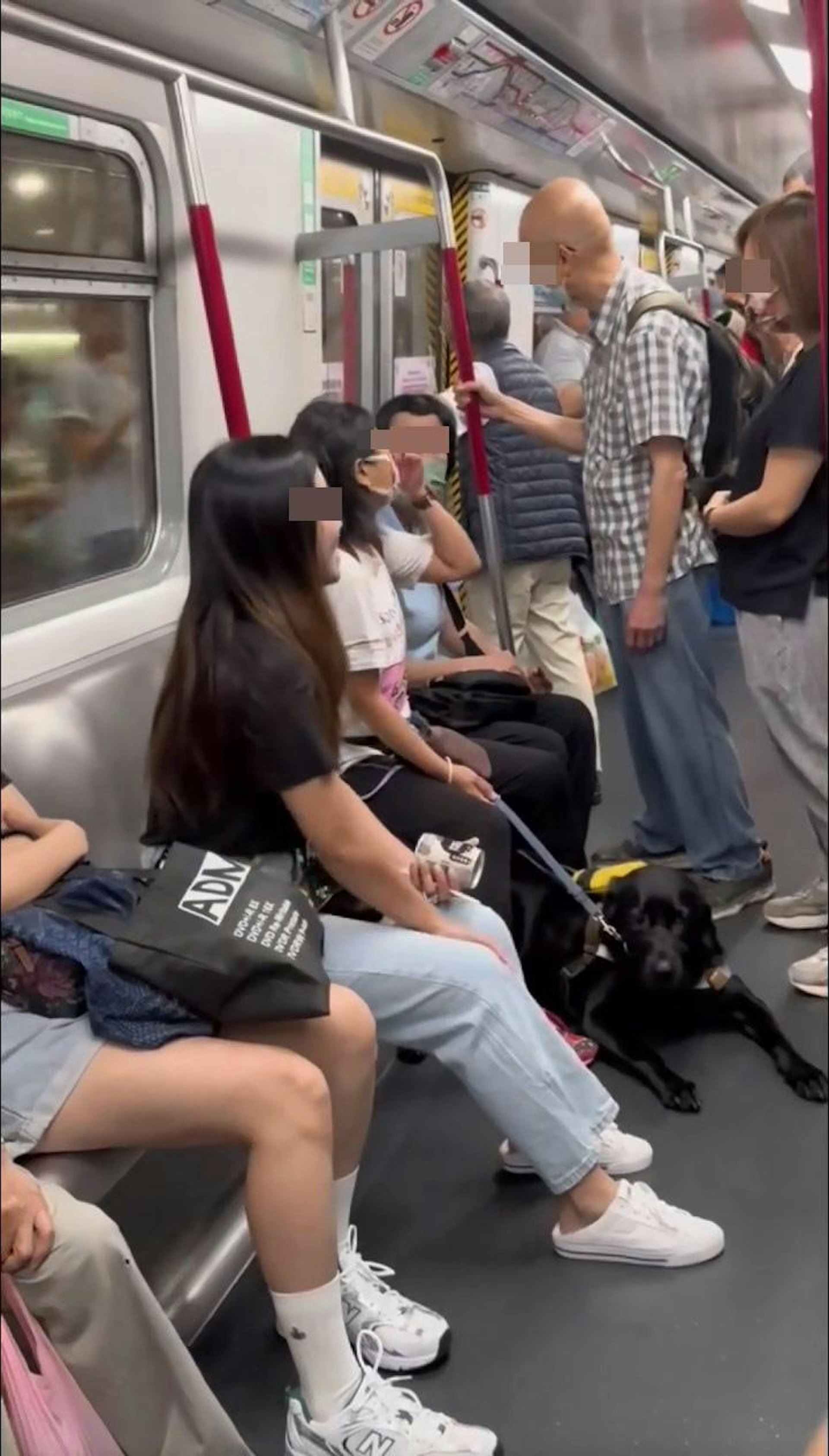 本港網絡瘋傳1段影片,見到港鐵車廂內1隻黑色導盲犬趴坐在失明女主人前面,卻被1名穿背心外套老伯不斷指罵,眼神似乎盡顯無奈。(影片截圖)公仔箱論壇; ]) D, v- \- j: h* q
