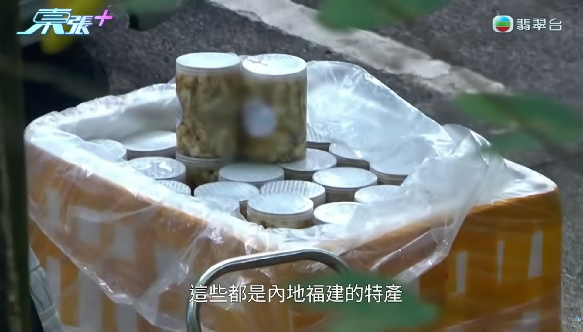 蓬瀛仙館附近的停車場附近,有貨車專門收貨,貨物包括福建土產如「五香卷」(雞卷)。(《東張西望》影片截圖)8 C+ j- M3 j; I/ J8 W