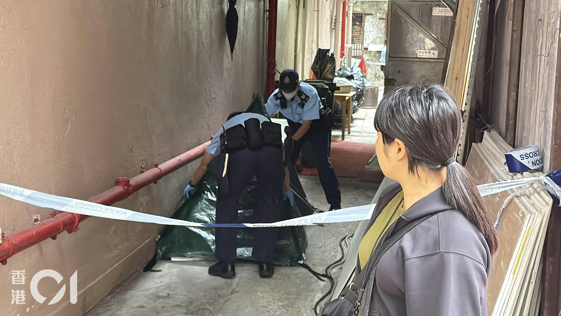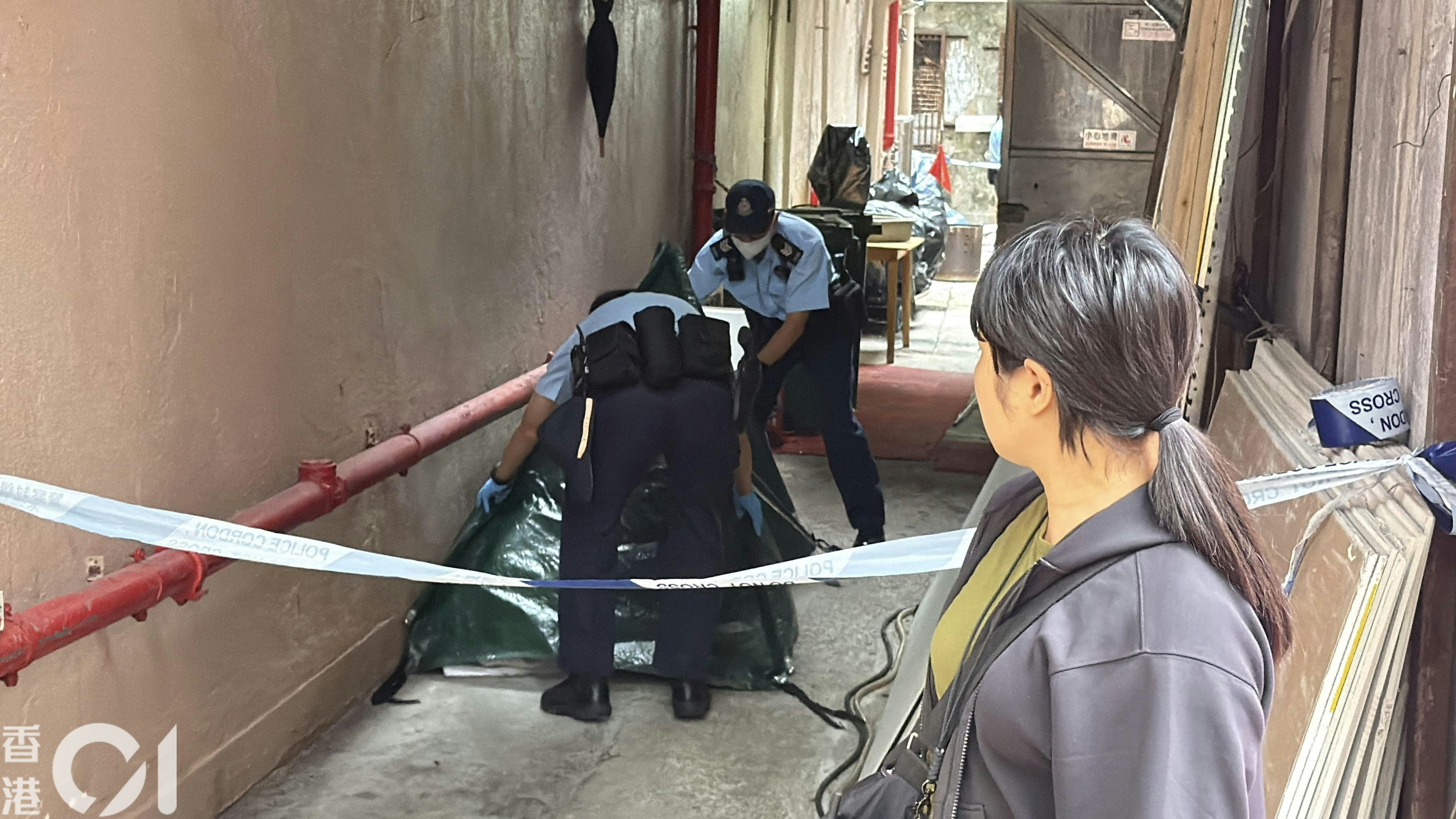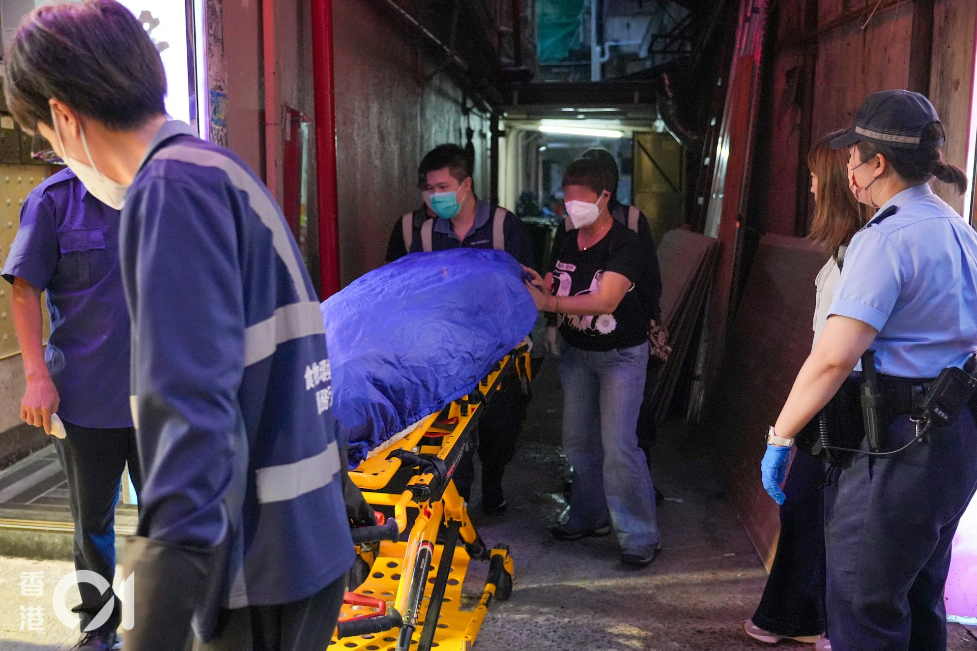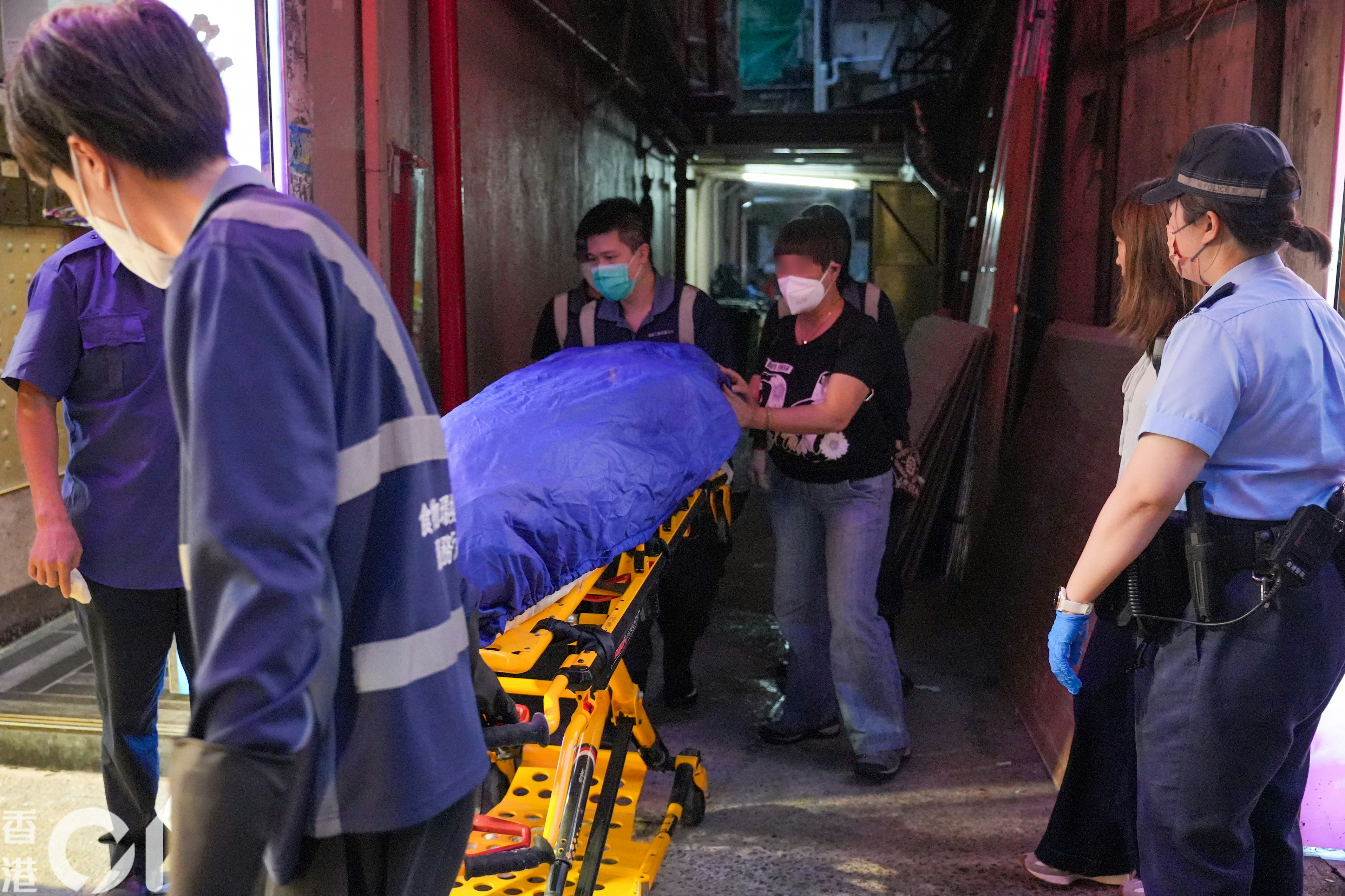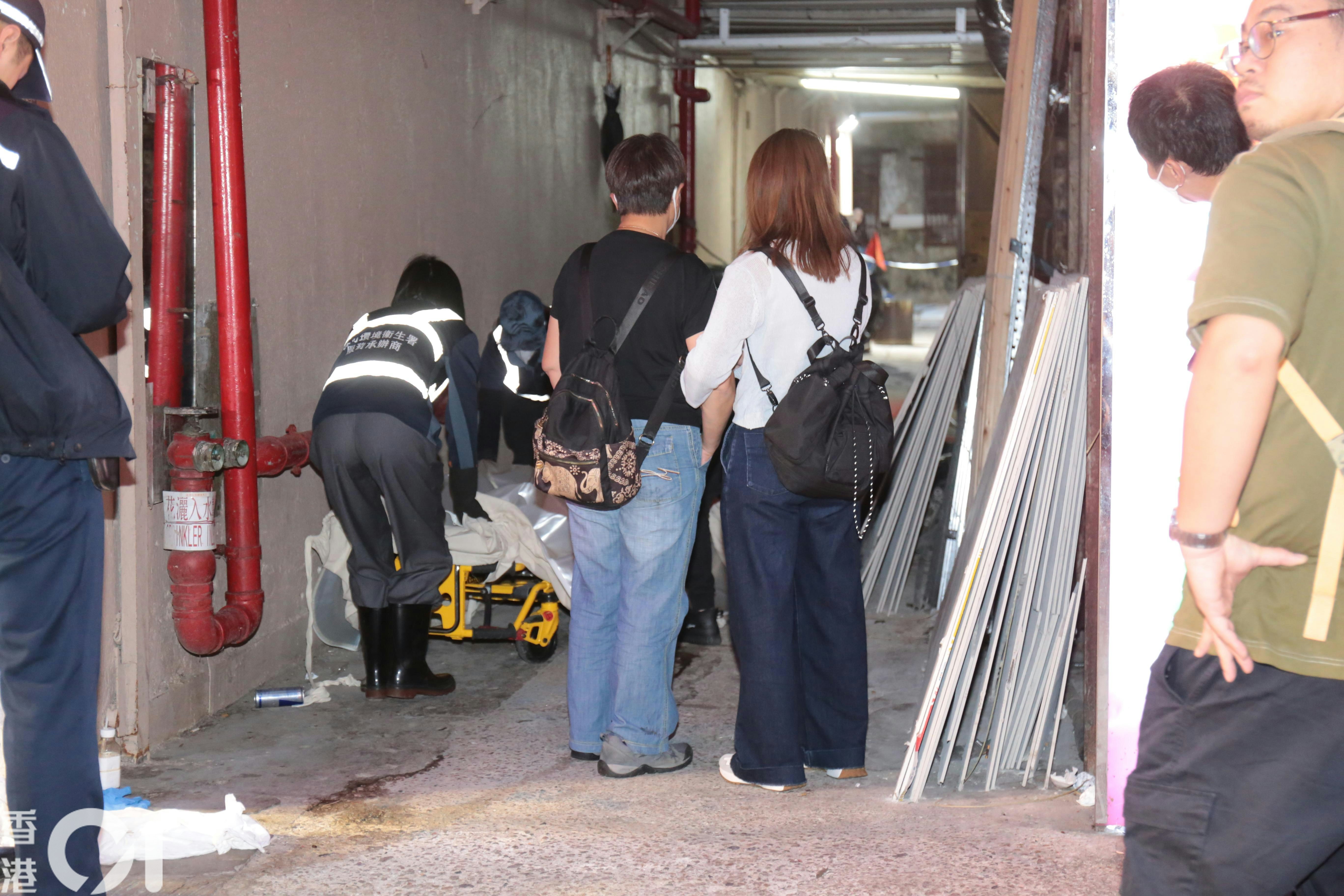 通渠公司東主在旺角砵蘭街一沙井通渠期間,懷疑吸入不明氣體暈倒被困,當場死亡。仵工舁走事主遺體時,其妻(黑衣者)在場目送丈夫離開。(梁偉權攝)