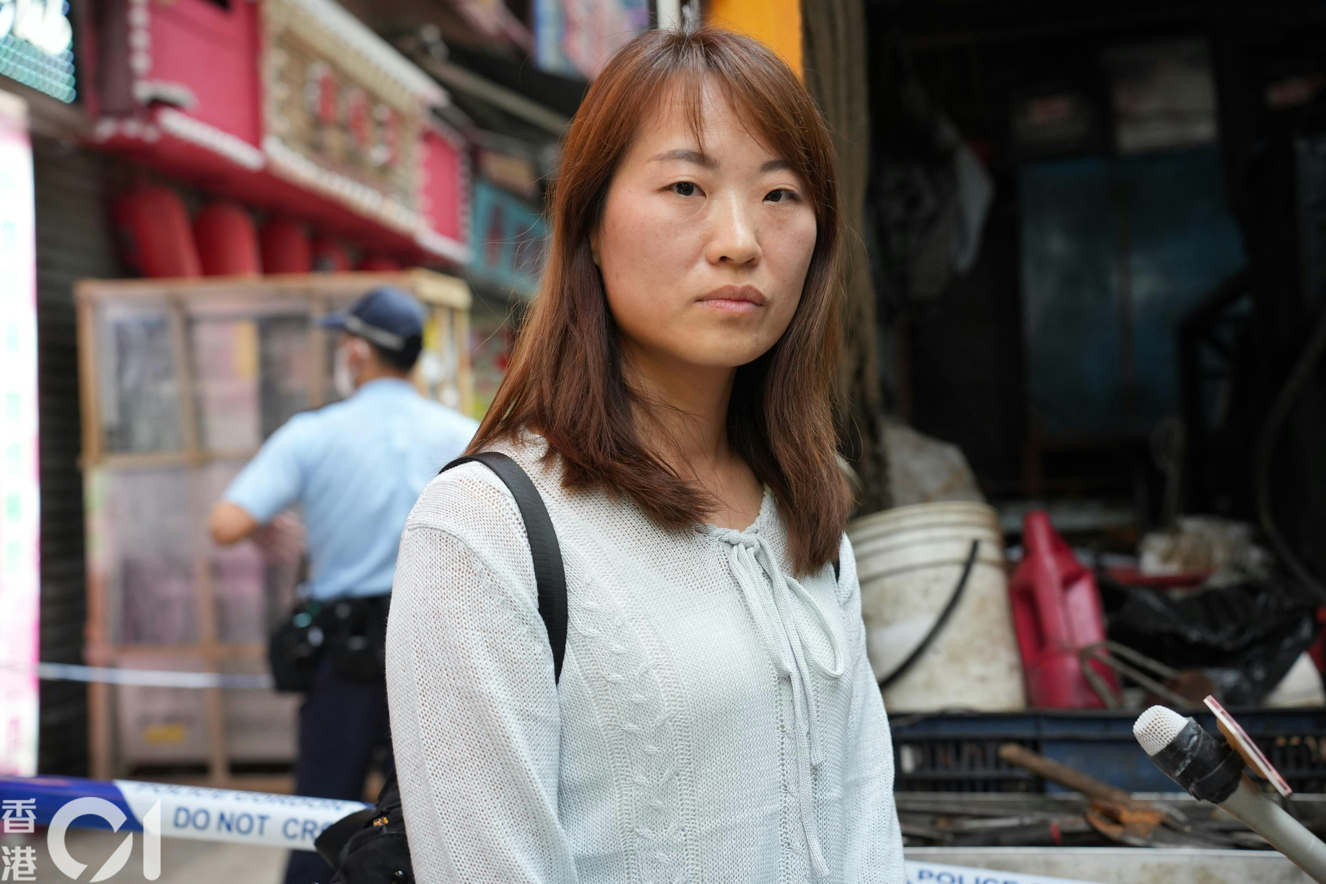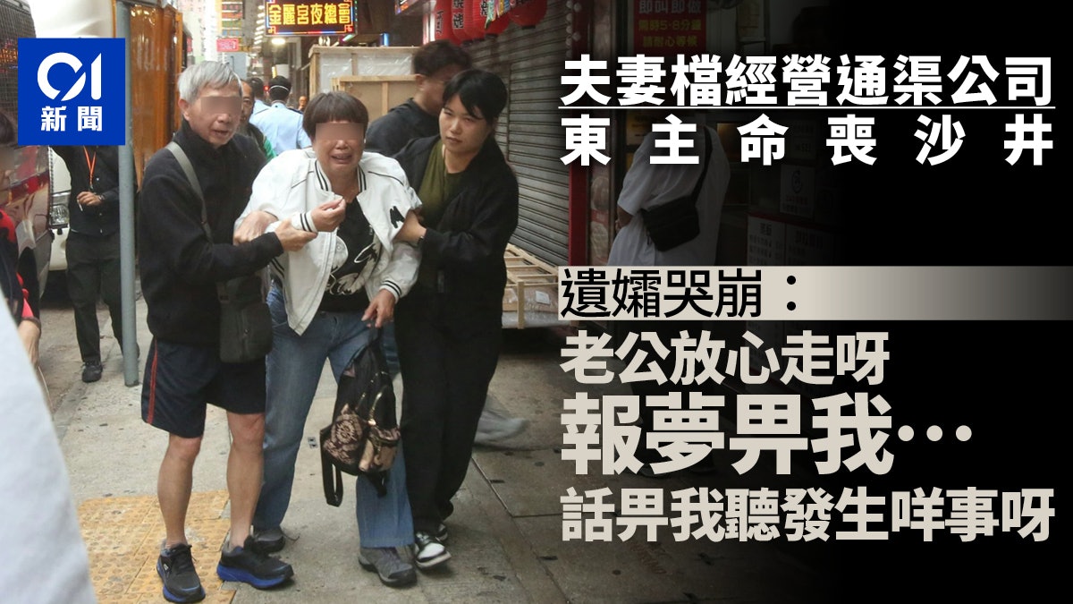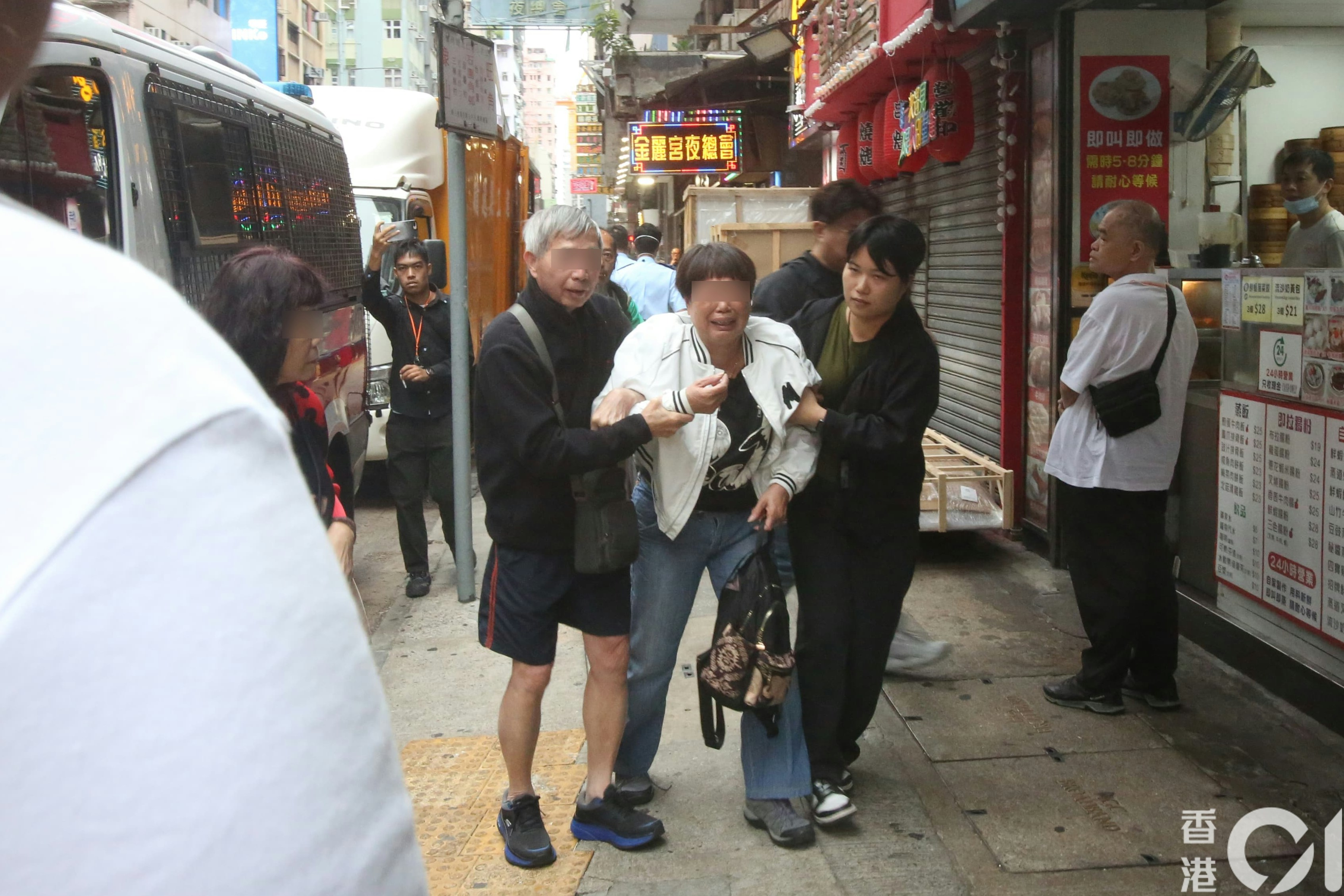 一名通渠公司東主在旺角砵蘭街工作時暈倒,被困渠內死亡,其妻(白衣者)激動痛哭,需由他人攙扶。