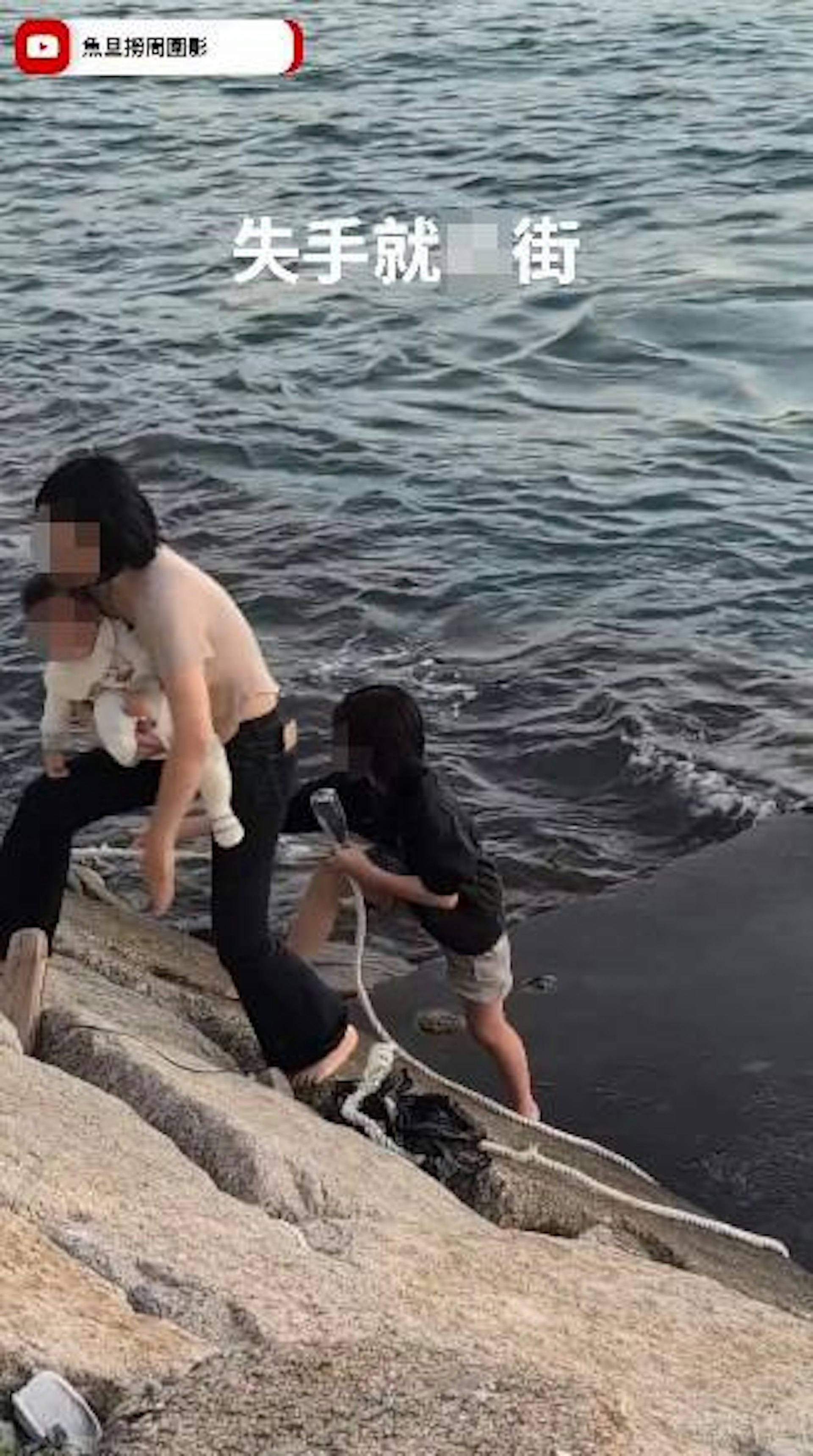 有港男於網上發文發片公審1名婦人,他在啟德海濱目擊該婦人手抱嬰孩,揩同兩名年幼子女爬到石坡下看海。(YouTube「魚旦撈周圍影」影片截圖)