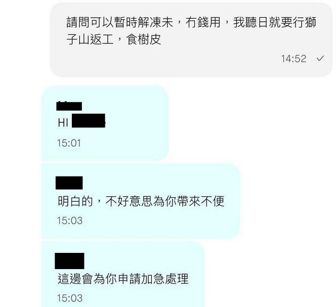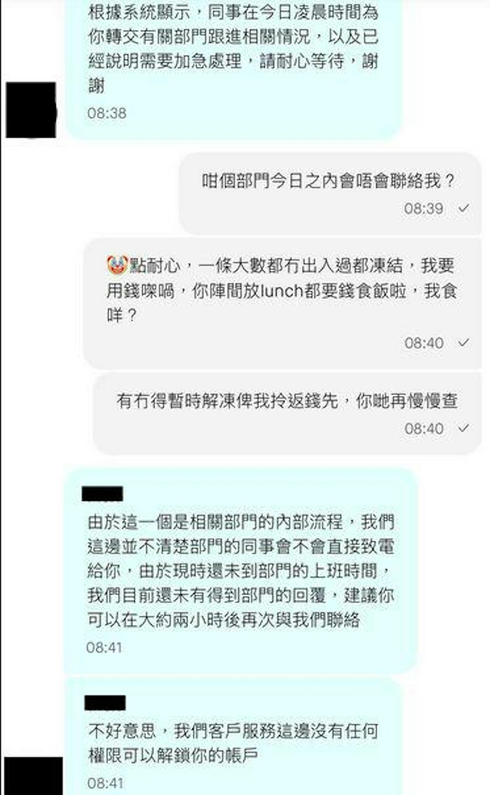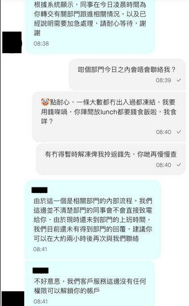 來到戶口被凍結第4天,客服仍說「會通知相關部門盡快處理」,樓主表示想取消戶口取會存款,「盡快都等咗4日喇喎,取消戶口拎返錢唔用你哋得唔得」,客服則稱要審查完才可以取消戶口,重申「戶口仍然在審查中,暫時未能轉帳,耐心等候」。樓主無奈問審查會否超過1個月」,客服回覆「視乎部門處理」。