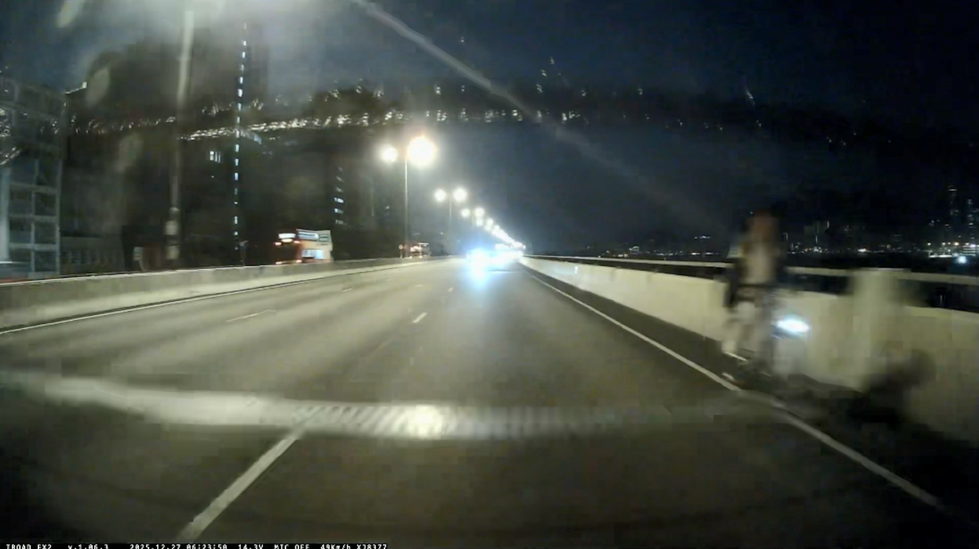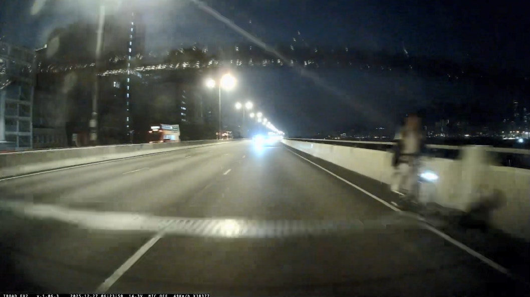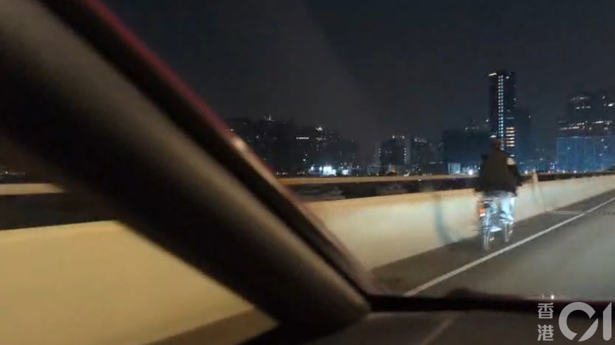 - X v$ w+ _8 a. F {( l+ @tvb now,tvbnow,bttvb觀塘繞道往啟德隧道方向,近九龍麵粉廠對開時,驚見一名男子沿著左邊路肩踩單車。(《香港01》車CAM截圖)