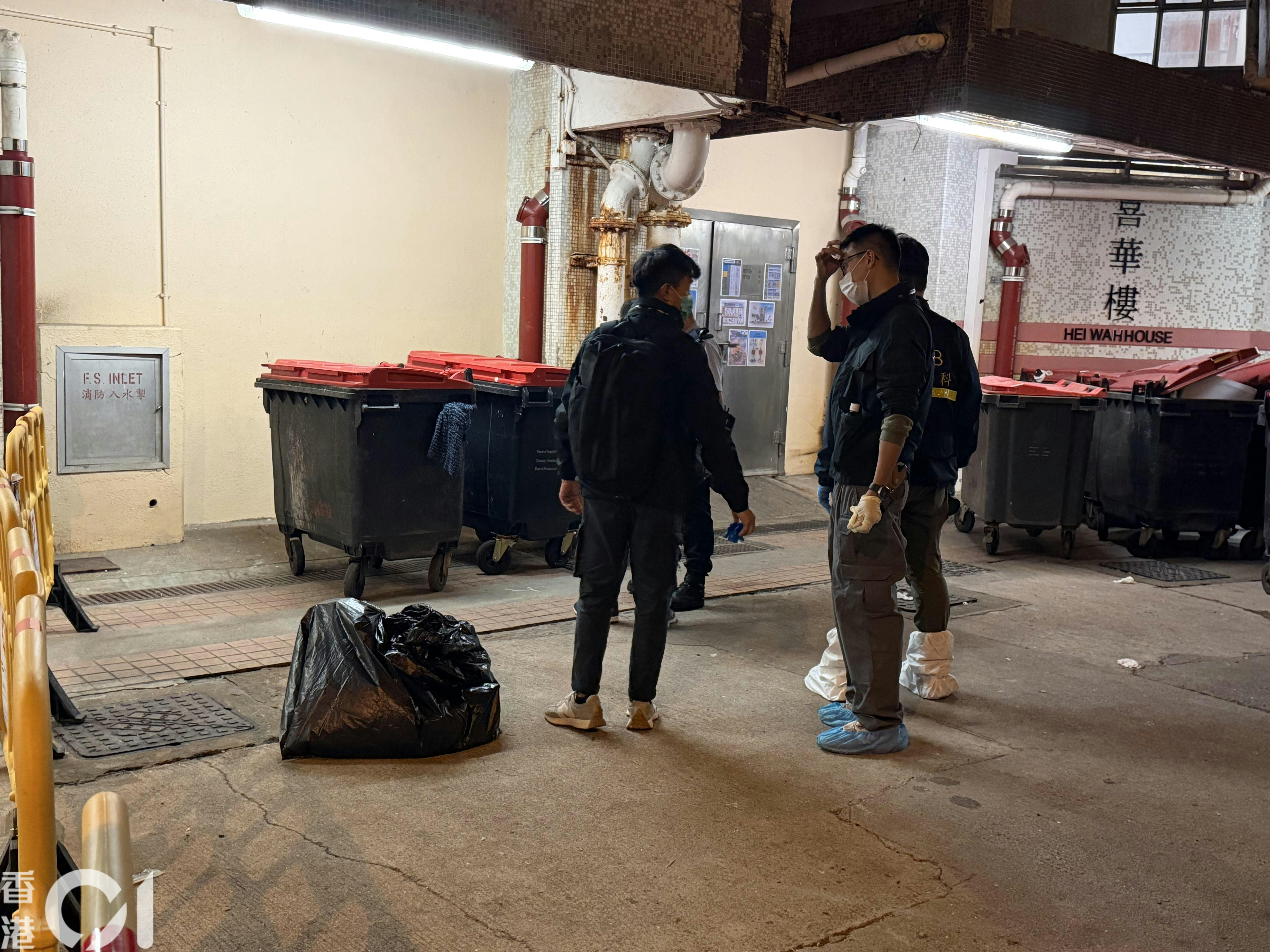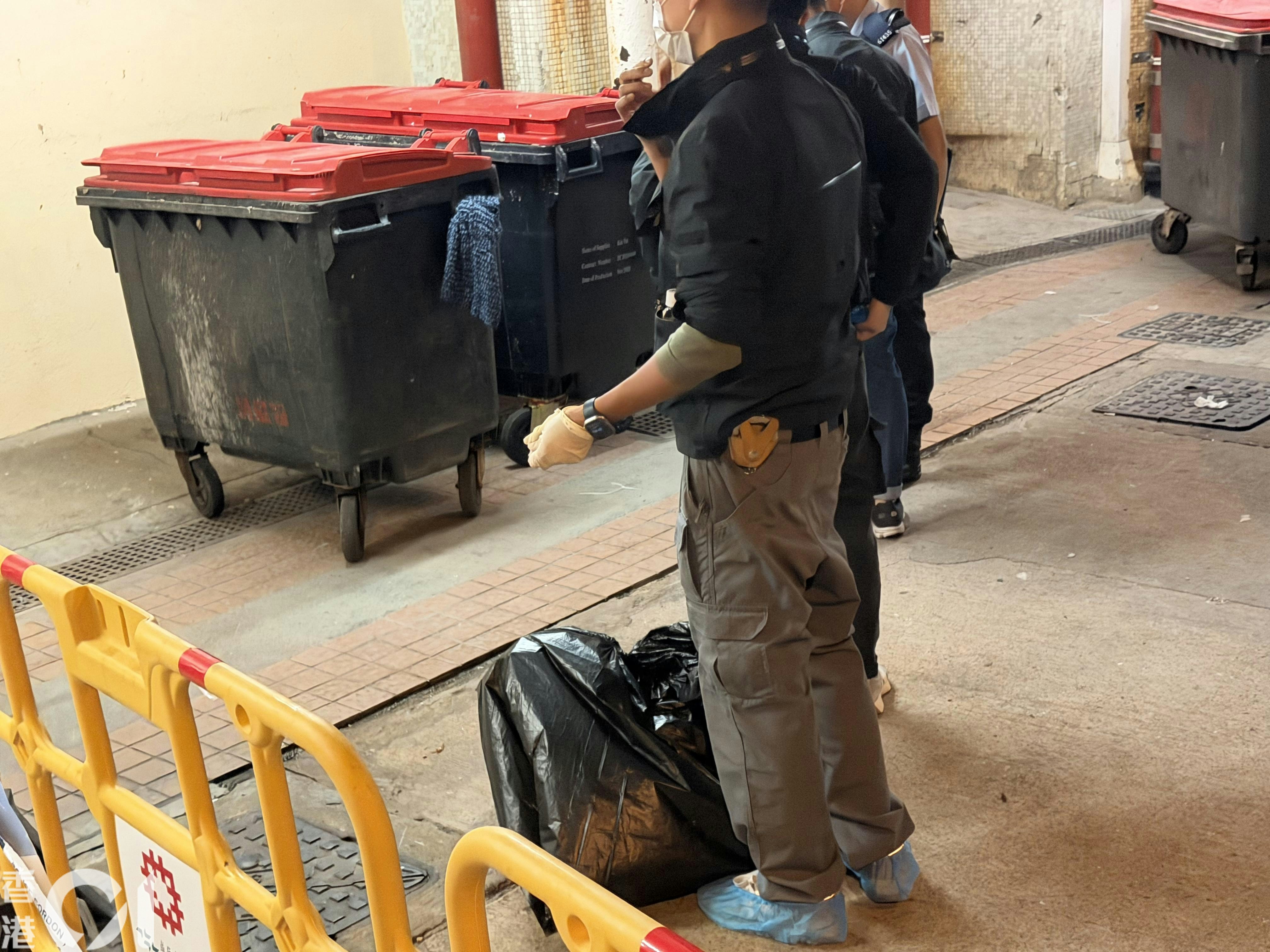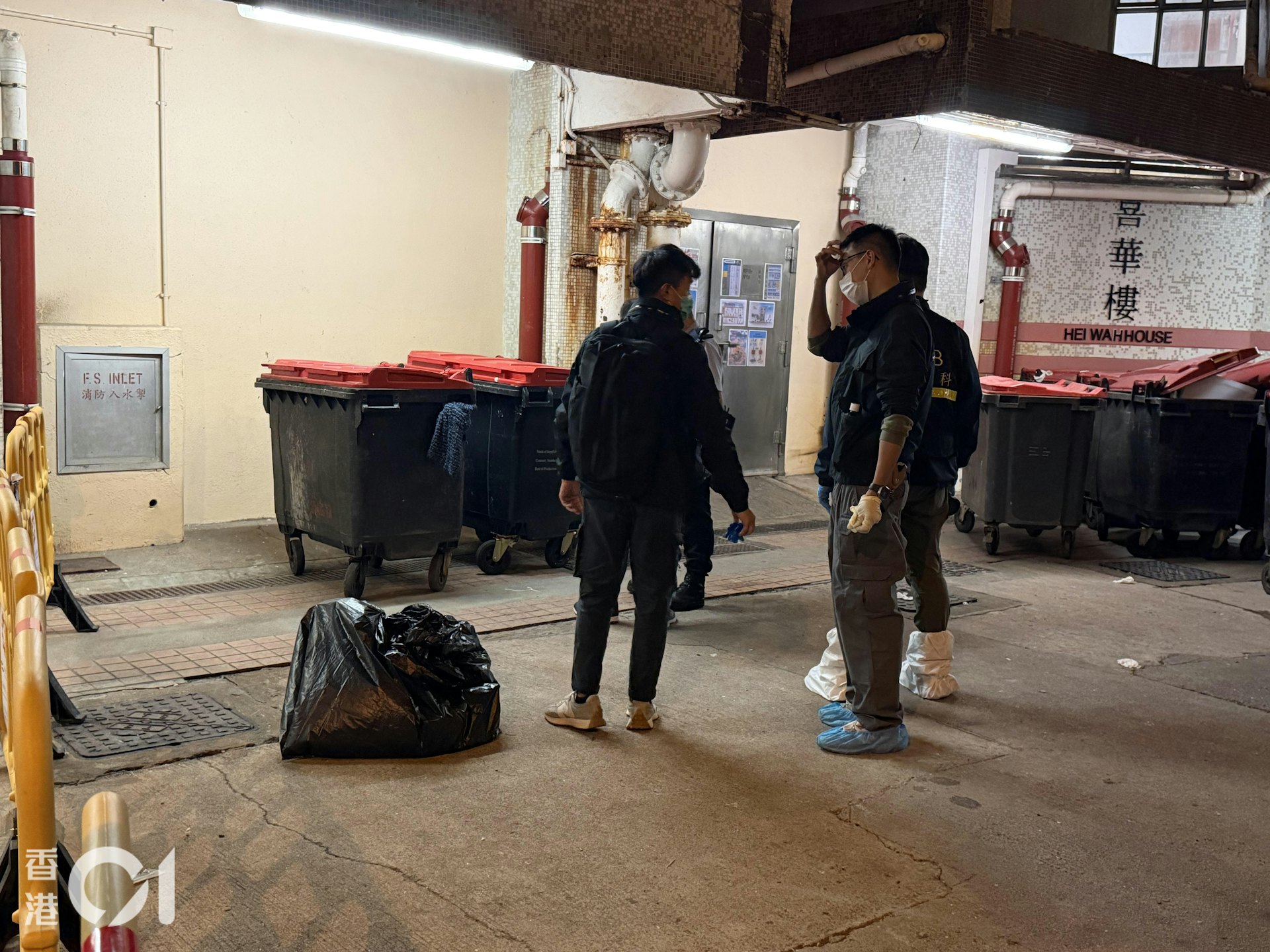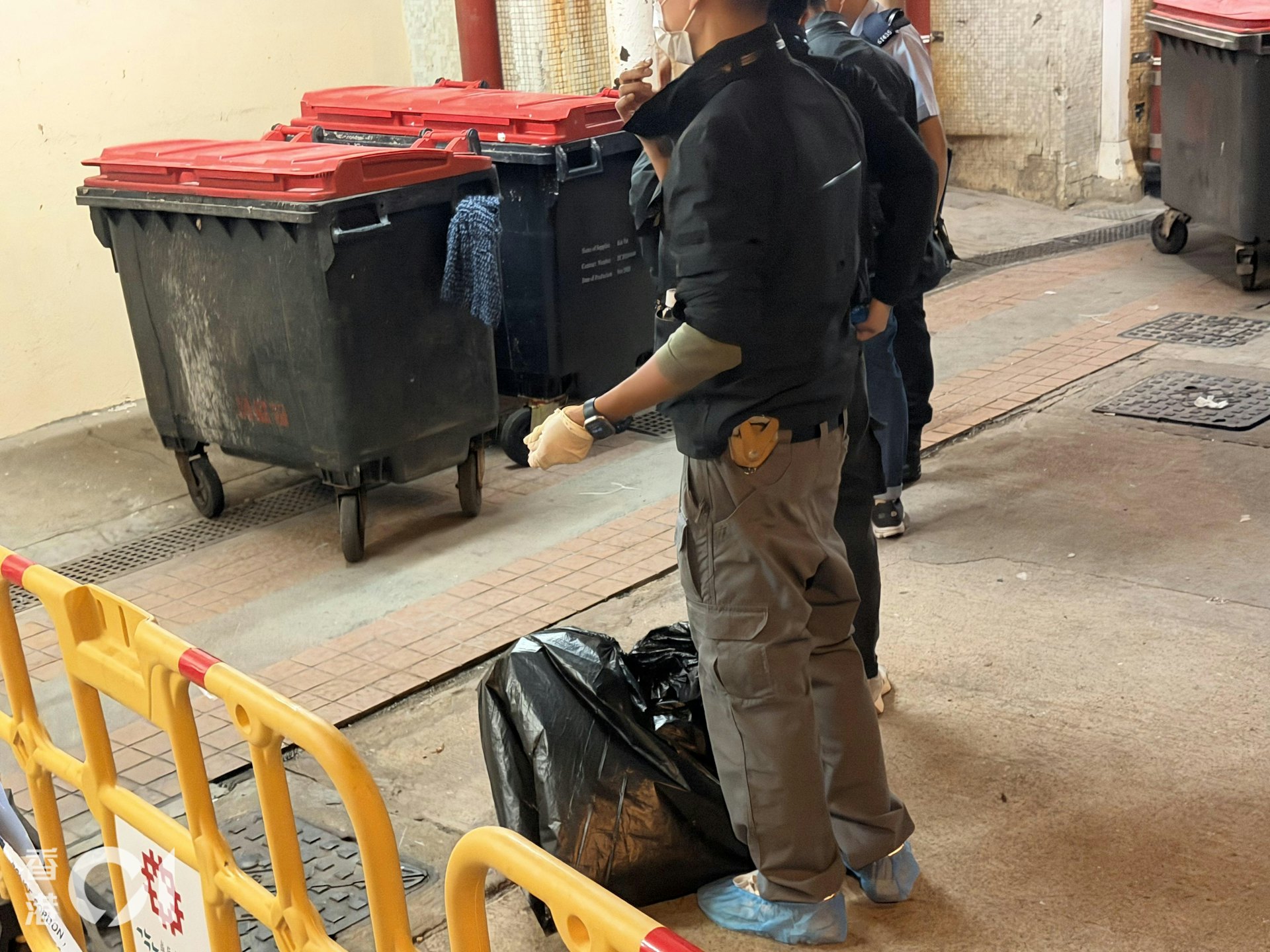 4 z$ A$ x- U8 y. U大批警員到牛頭角樂華南邨調查及搜證,從垃圾房取出一袋以黑色膠袋裝着的物品,鑑證科人員拍照記錄。(戴慧豐攝)
