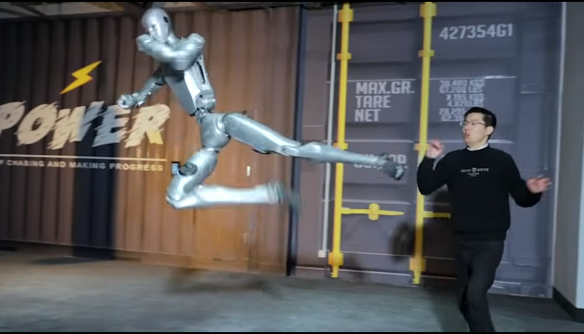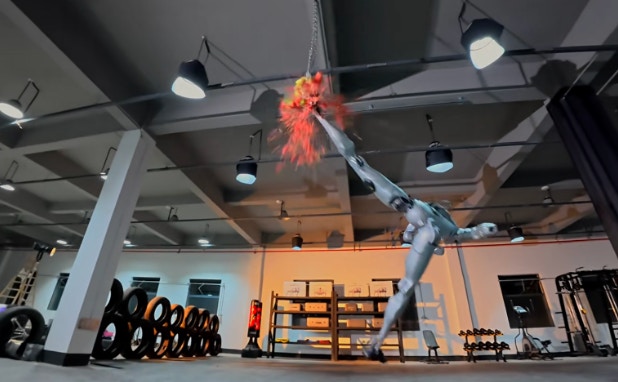 6 S$ x- m2 Z; m: BTVBNOW 含有熱門話題,最新最快電視,軟體,遊戲,電影,動漫及日常生活及興趣交流等資訊。1月4日晚,宇樹科技官方發佈人形機械人H2的最新訓練影片。影片中,身高180厘米、體重70公斤的H2靈活順暢地展現了一系列新的動作能力,包括騰空側踢、空中回旋踢等。機械人緊接著助跑後騰空側踢,腿部甚至高度超成人頭頂,站在旁邊的宇樹科技創始人王興興也被嚇到,驚訝避讓後退的畫面意外成為焦點。
