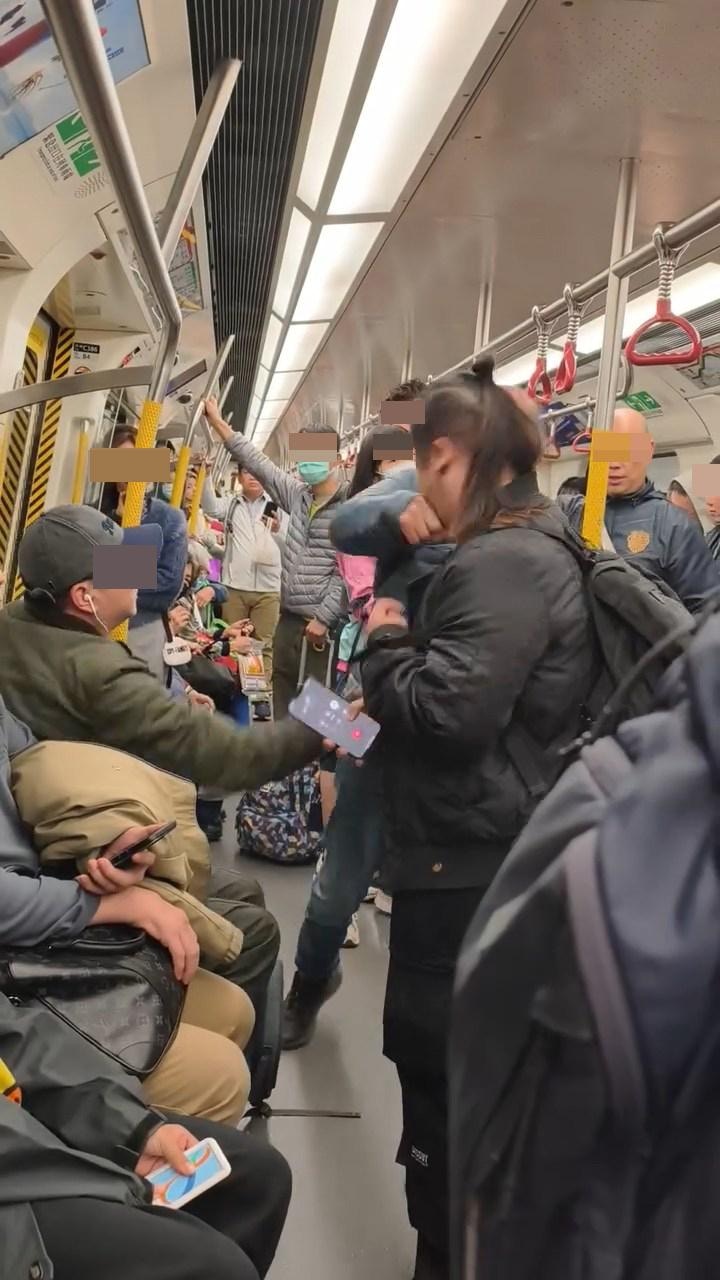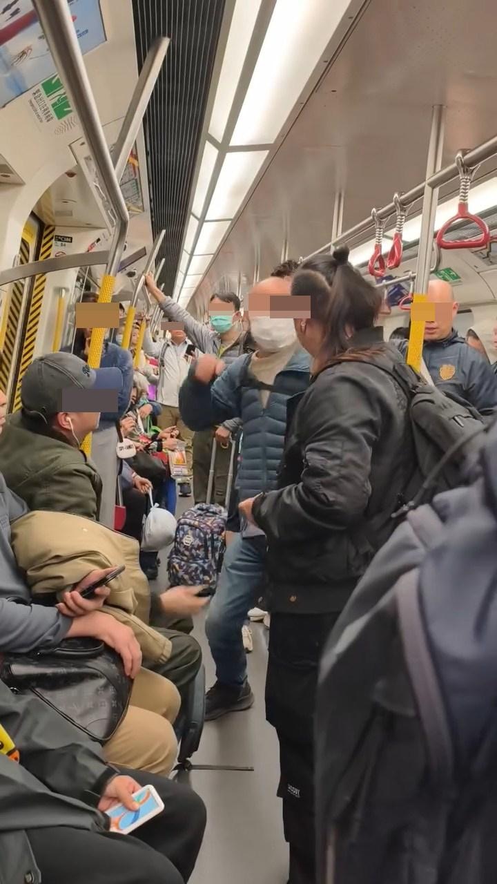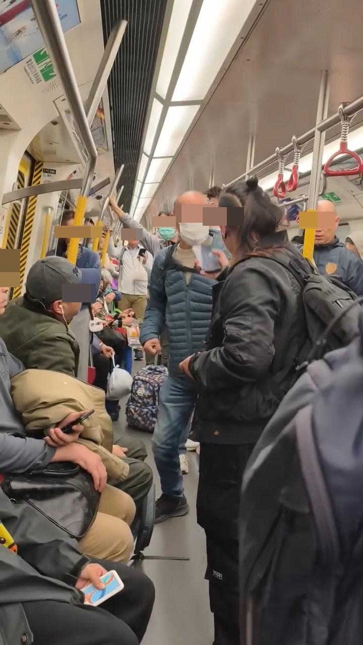 本港網絡瘋傳影片,指港鐵車廂內有阿伯「爆粗」揮拳打女乘客頭部。(Threads@eugenfung)