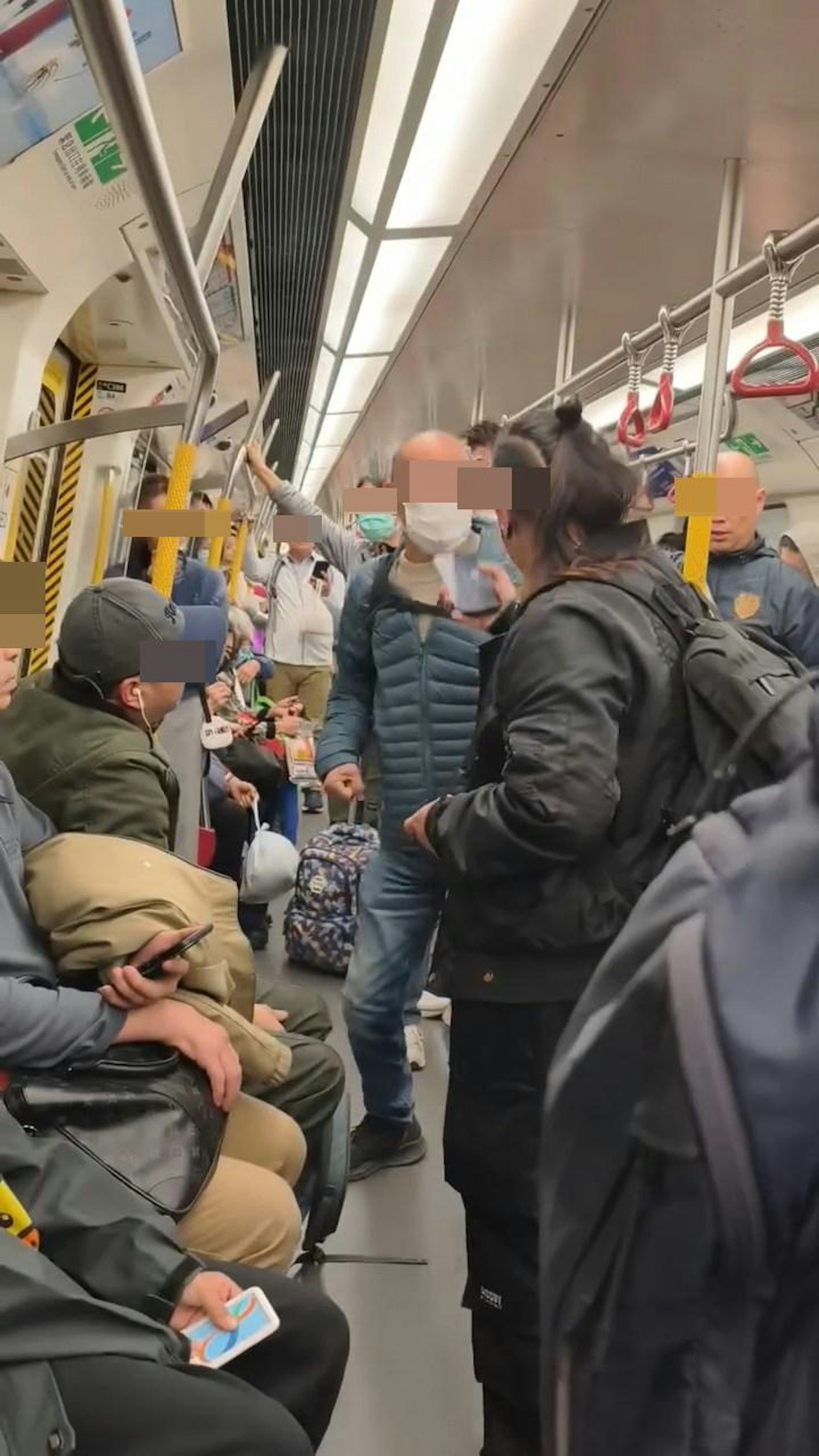 6 u: z: `, R& F, I9 P, l. L本港網絡瘋傳影片,指港鐵車廂內有阿伯「爆粗」揮拳打女乘客頭部。(Threads@eugenfung) d9 C. I% i# y3 |3 W1 J3 }6 v