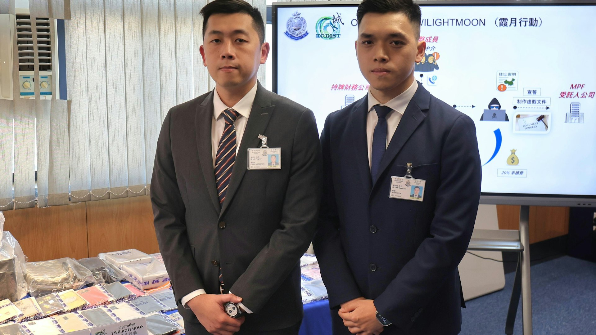 警方九龍城警區助理指揮官(刑事)署理警司廖秉科及科技及財富罪案組督察譚鈞鎧交代案件。(梁偉權攝)