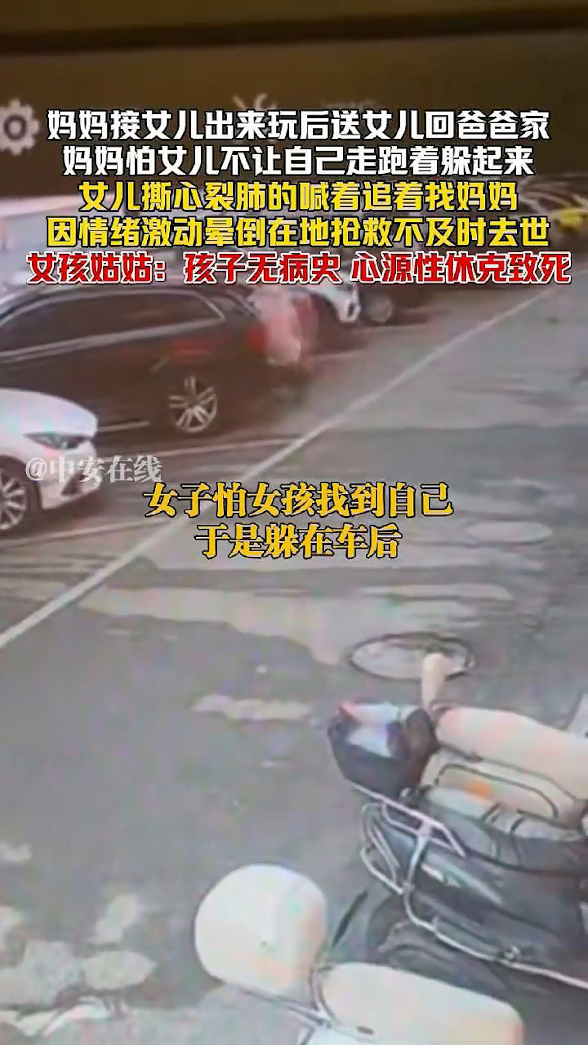 湖南一名女童的雙親離異,媽媽11日帶女兒出去玩,臨別時要把孩子送回前夫家,擔心女兒捨不得自己,便躲起來不讓孩子找到,沒想到女兒撕心裂肺追趕母親,又找不到人,情緒崩潰、太過激動,竟當場心因性休克暈厥,搶救不及身亡。(截取自微博@中安在線)