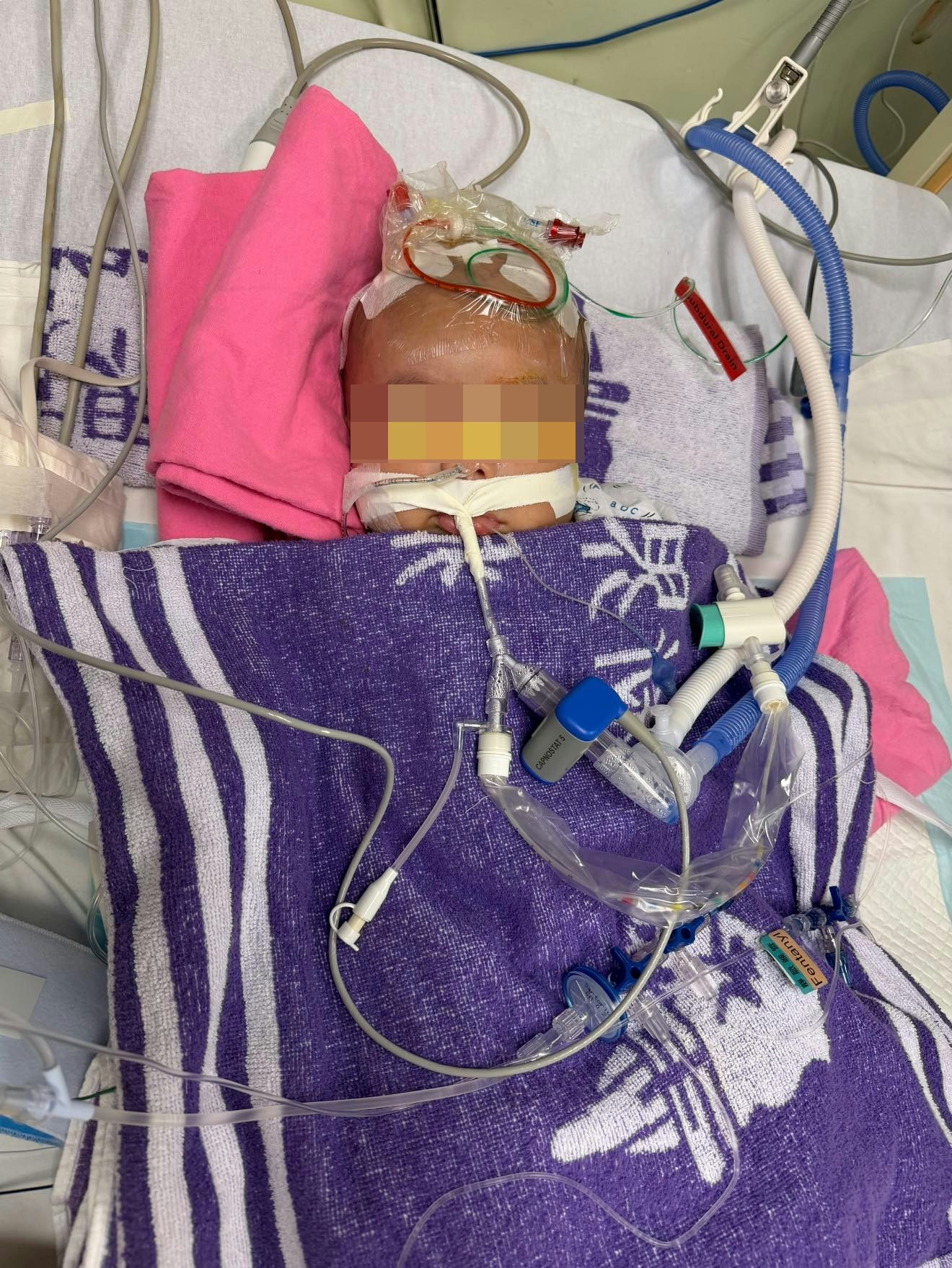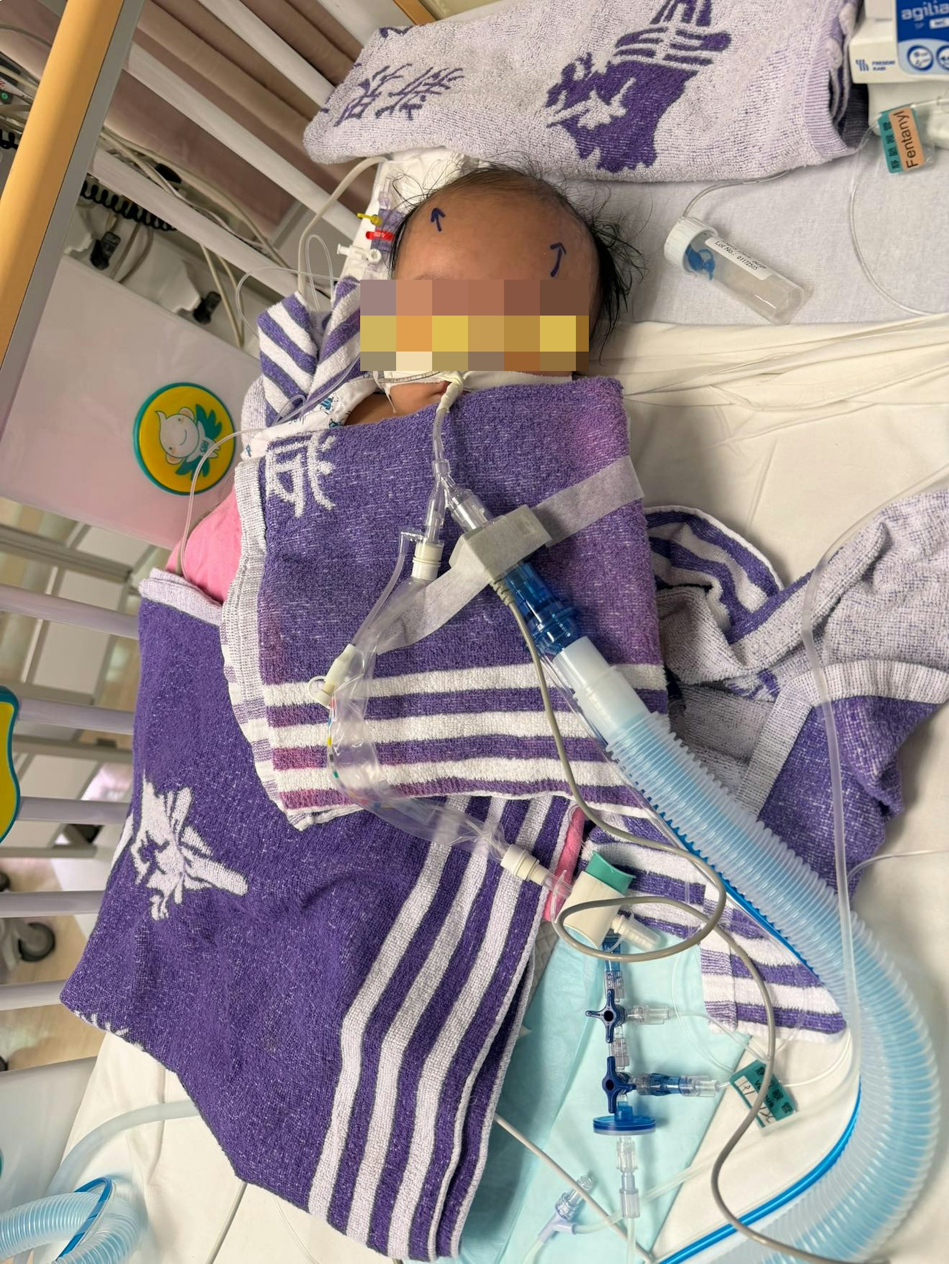 4個月大男嬰「細波」疑遭外傭大動作搖晃及叉頸虐待,導致腦出血要接收緊急手術,在醫院兒童深切治療部留醫。 (「細波」父親盧先生提供)