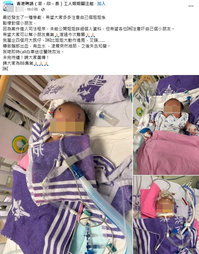 4 s0 e7 J: y% X4個月大男嬰「細波」疑遭外傭大動作搖晃及叉頸虐待,導致腦出血要接收緊急手術,在醫院兒童深切治療部留醫。父親盧先生在社群平台發帖,希望外界為「細波」集氣,讓他早日度過難關。 (「細波」父親盧先生fb貼文截圖) |