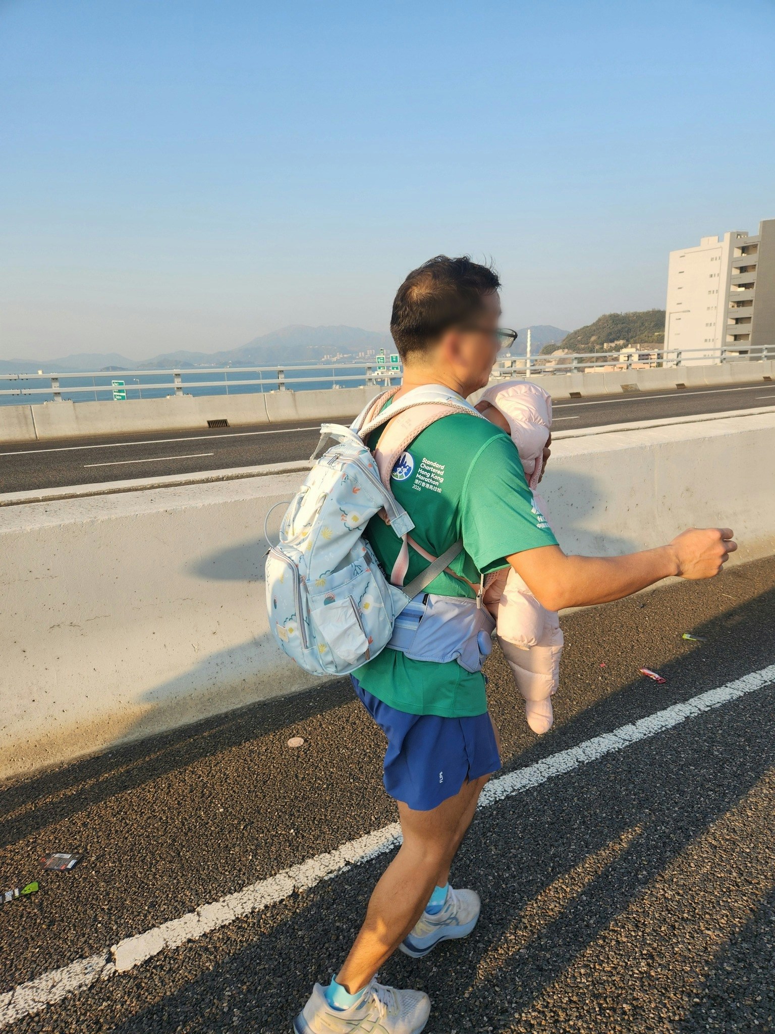 一名男跑手前孭嬰兒參加全馬比賽,眼鏡「半甩」。(FB Wong Chun Fai)