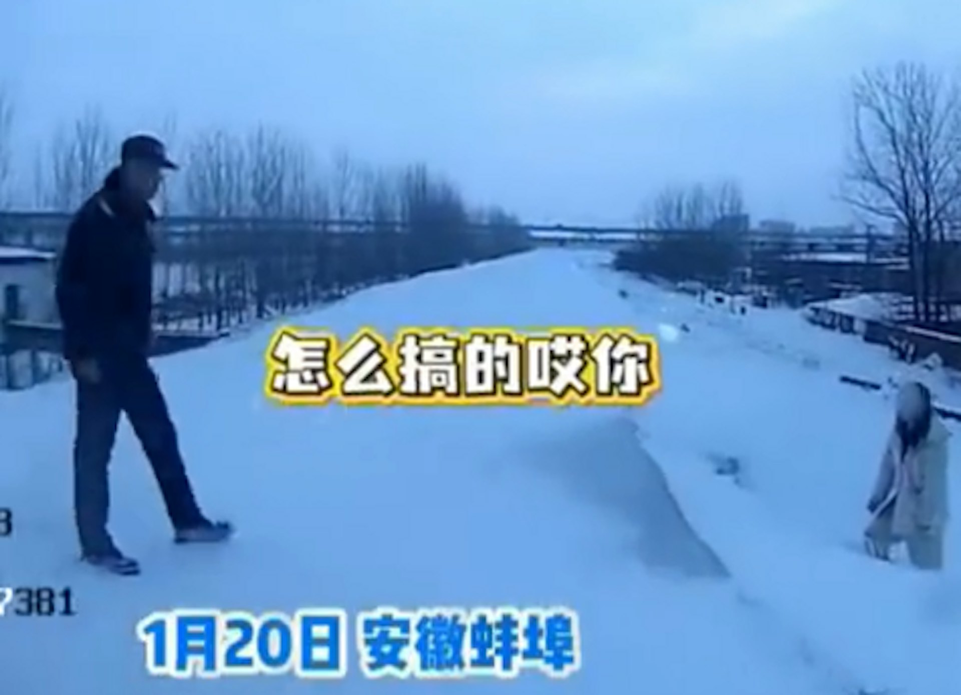 根據「南華視頻」微博報導,安徽省蚌埠市近日因嚴寒天氣出現積雪結冰現象。21日清晨,淮河大壩上出現一個形跡可疑的「人影」,一動不動,因恐懼不敢上前查看。