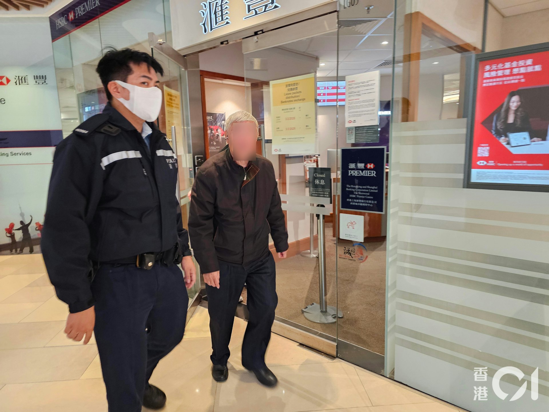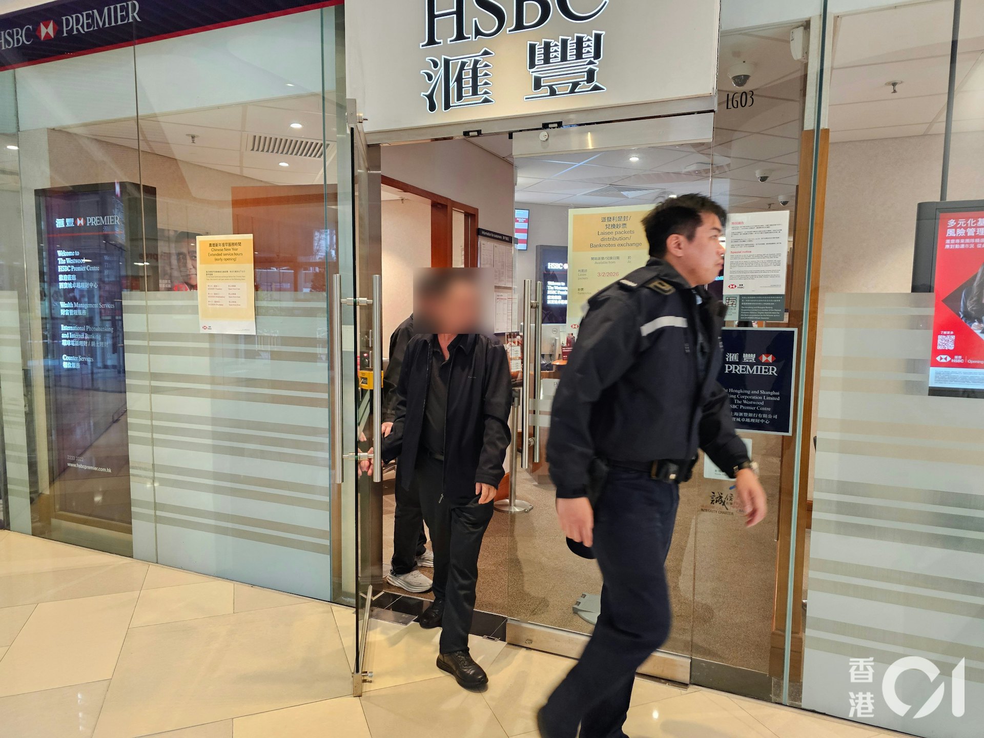 西環卑路乍街西寶城滙豐銀行,4男女疑持「假支票」領取100億美金,被警員拘捕。(梁偉權攝)