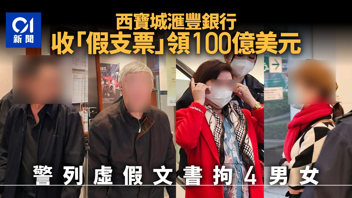 : |: @4 r3 L6 _( @1 q" gtvb now,tvbnow,bttvb西環卑路乍街西寶城滙豐銀行,4男女疑持「假支票」領取100億美金,被警員拘捕。(梁偉權攝)# [8 U# G( b7 Z& ]0 O