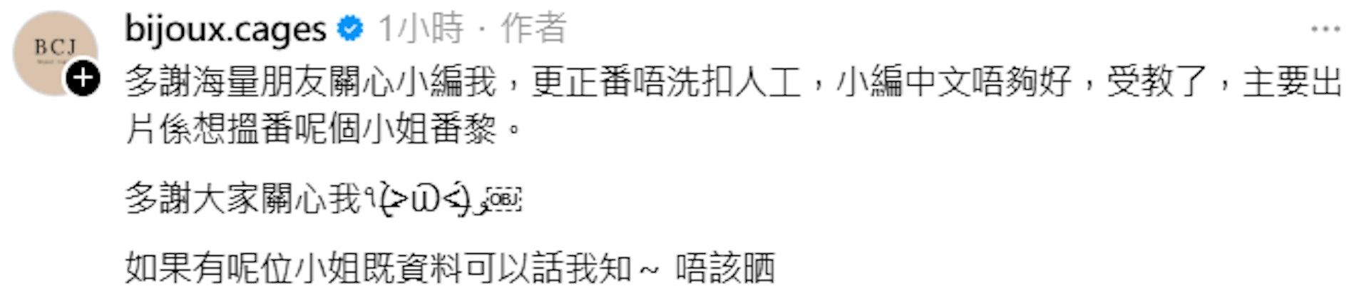 面對網民質疑,店方回覆時以「小編」身分澄清「暫時都未使扣人工住,多謝大家關心我份人工」。店方強調,發布影片原意是想女子回來付款,「報警可以搵到佢都會係下一步」,但擔心機會渺茫,「之前有經驗俾人偷咗個電話,報警都搵唔到啊」。