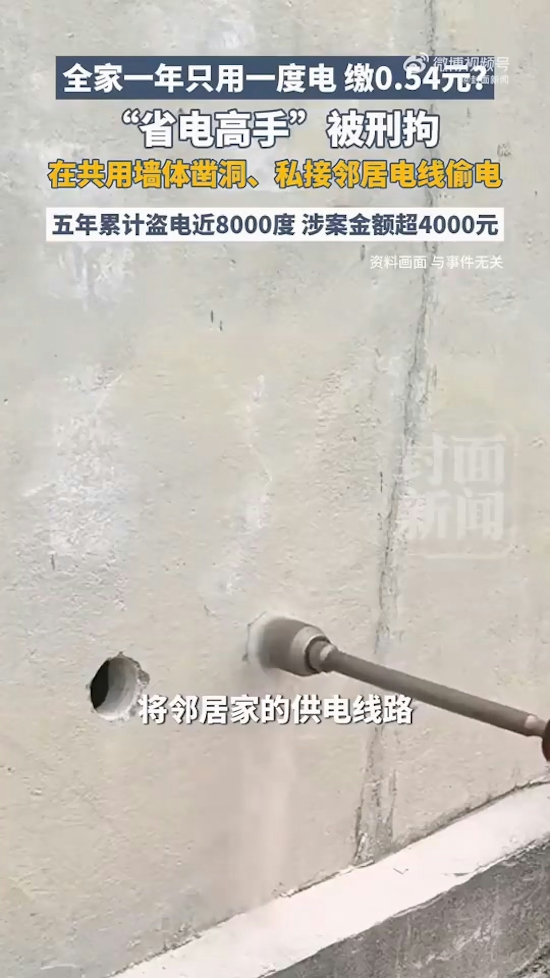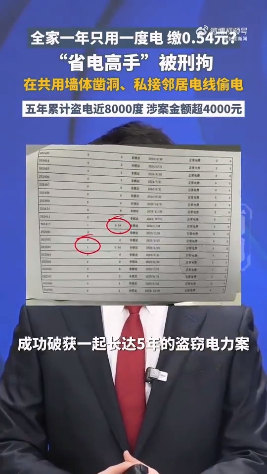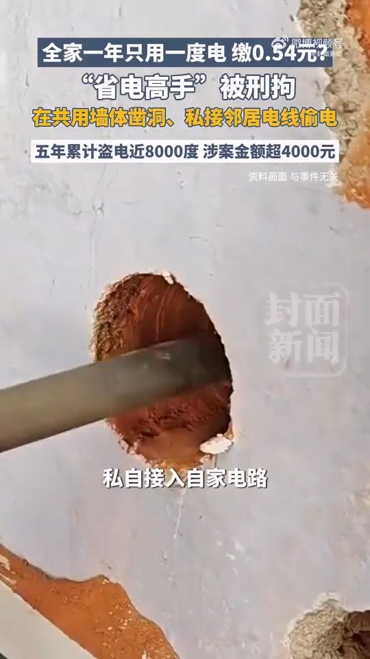 浙江一名陳姓男子長期盜用鄰居家的電力,5年下來累計高達8000度,總金額超過4000元人民幣,而他自家每年的用電量僅有1度,只要繳納0.54元人民幣的電費。
