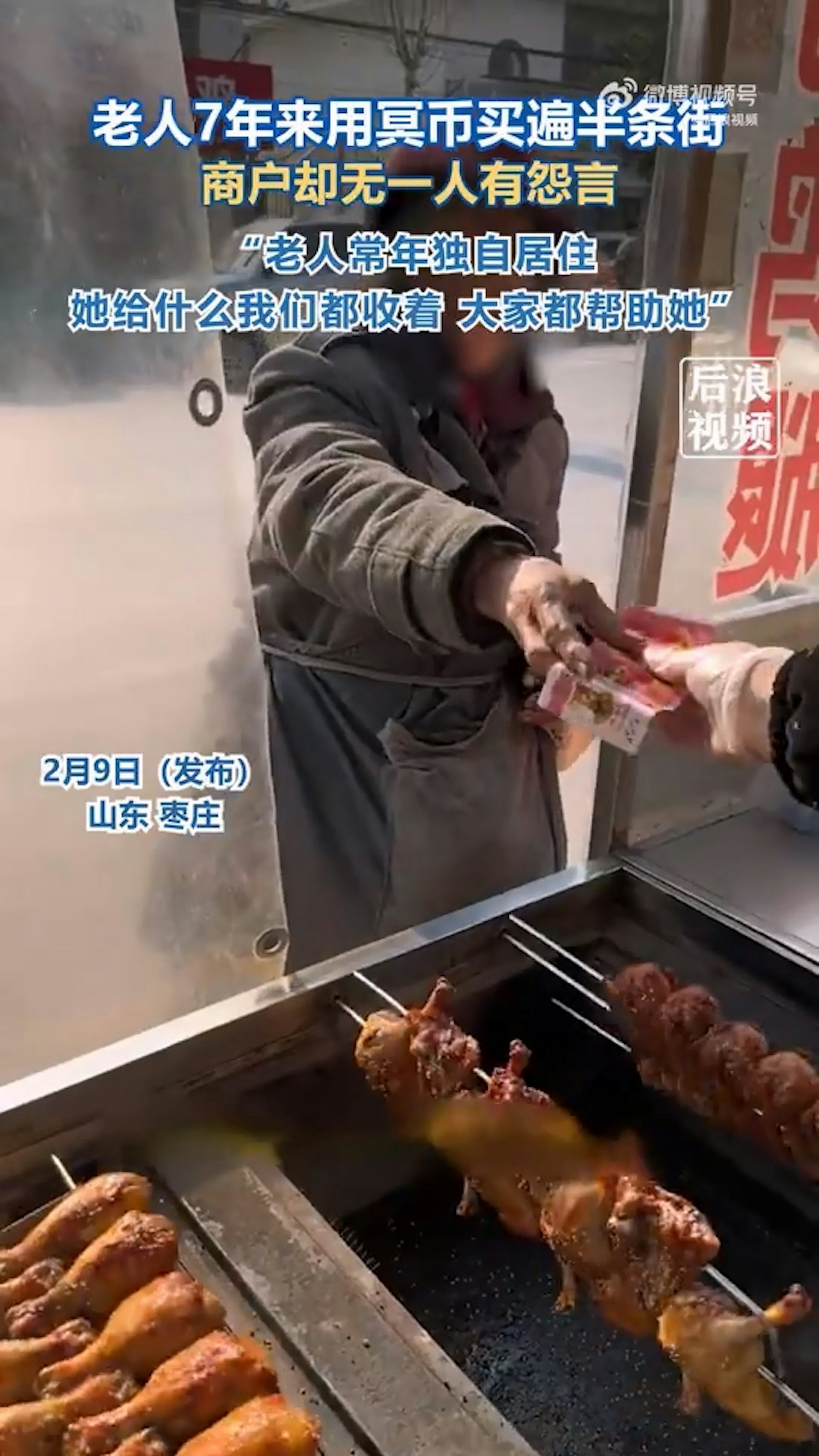 山東70歲老婦連續7年在小吃街用卡片、冥幣等換取食物,攤主們不僅毫無怨言還特別配合。(微博/後浪視頻)' {; L0 Y6 J6 f. p& E* H3 u8 {