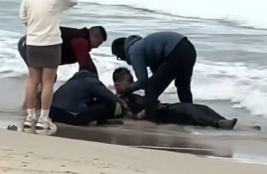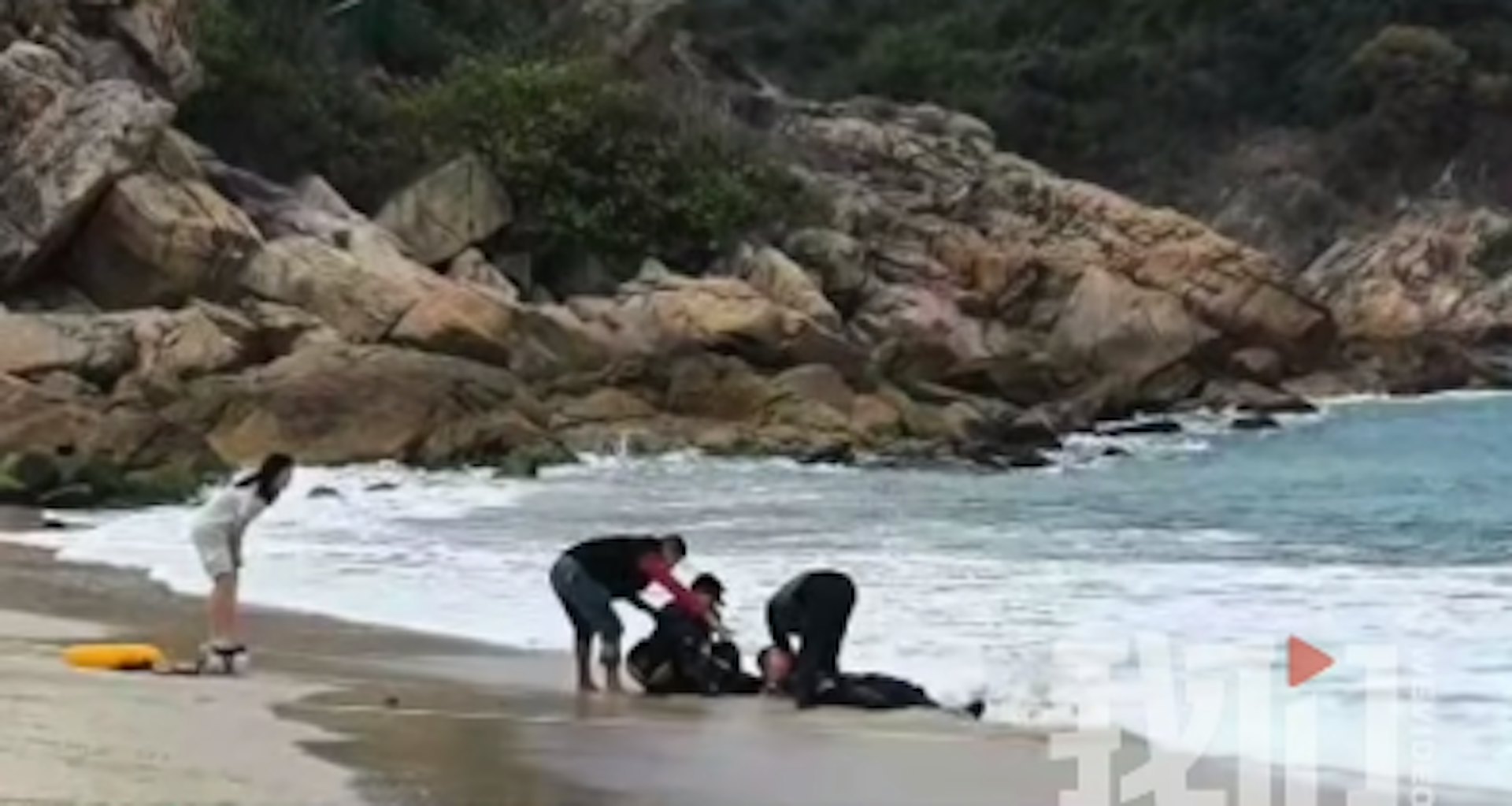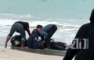 ' [6 b' e2 }$ ?7 X. L, L一遊客體驗滑翔傘項目後墮落在沙灘上。(新京報我們視頻)