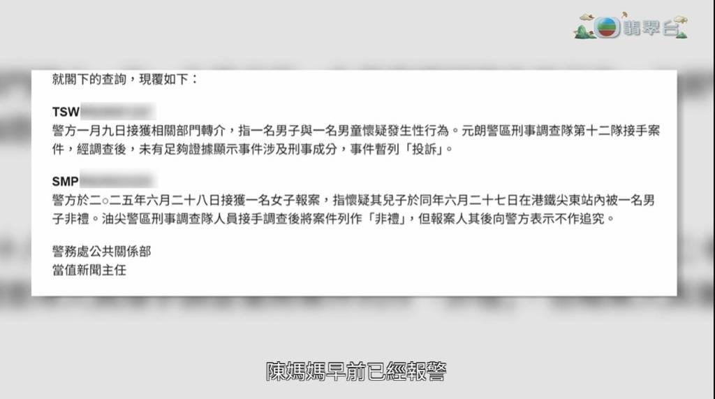 就此嚴重事件,警方回覆《東張西望》時指出,去年1月曾接獲相關轉介個案,惟調查後未有足夠證據顯示涉及刑事成分。至去年6月,警方再接獲陳媽媽報案,「指其兒子懷疑被一名男子非禮,案件列作非禮處理,但報案人其後向警方表示不作追究。」這個處理結果令人質疑,究竟是真的證據不足?還是受害者在壓力下被迫放棄?隨即引起社會各界的廣泛關注。www2.tvboxnow.com) r. Z9 f$ q3 F/ y" N