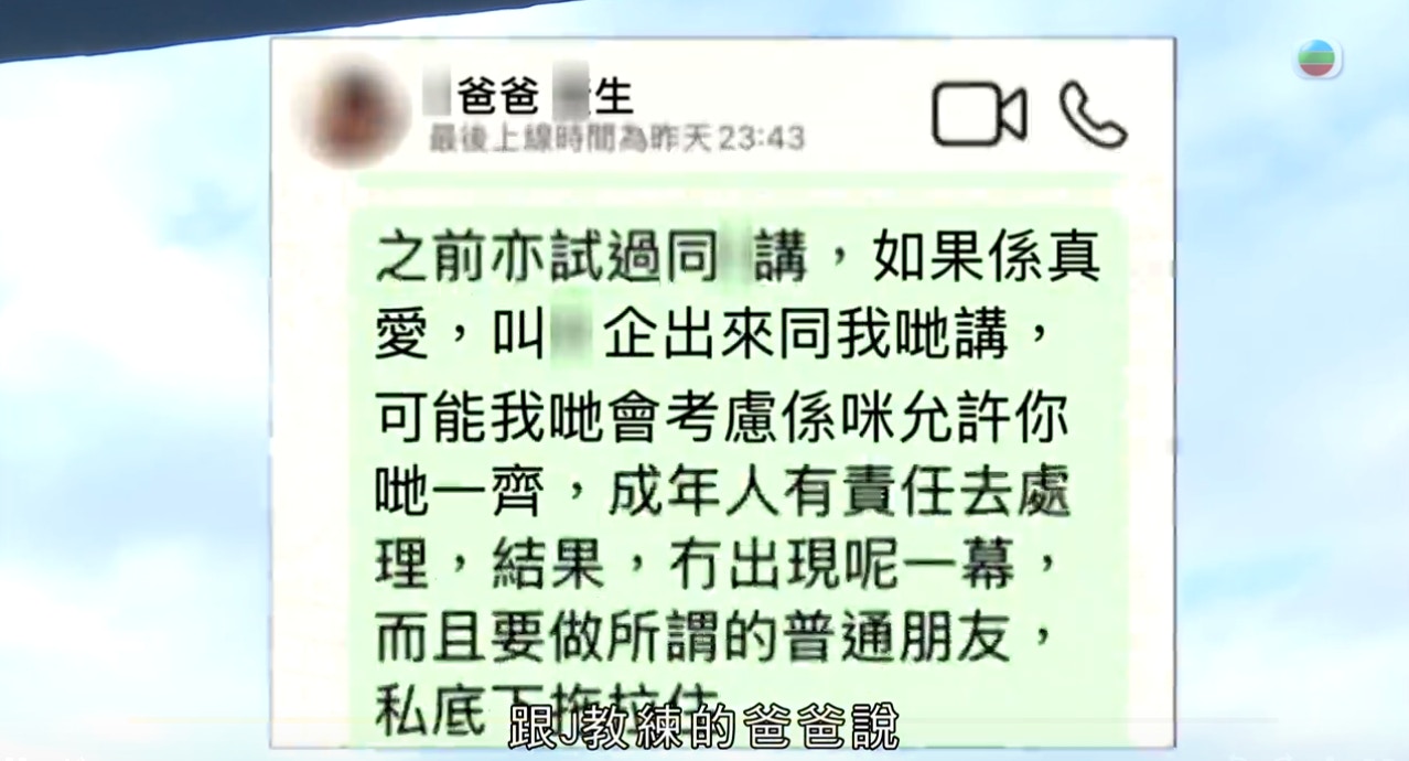 $ |1 l" i" r7 P5 g" D. Q6 c陳媽媽曾直接向J教練攤牌。(TVB)