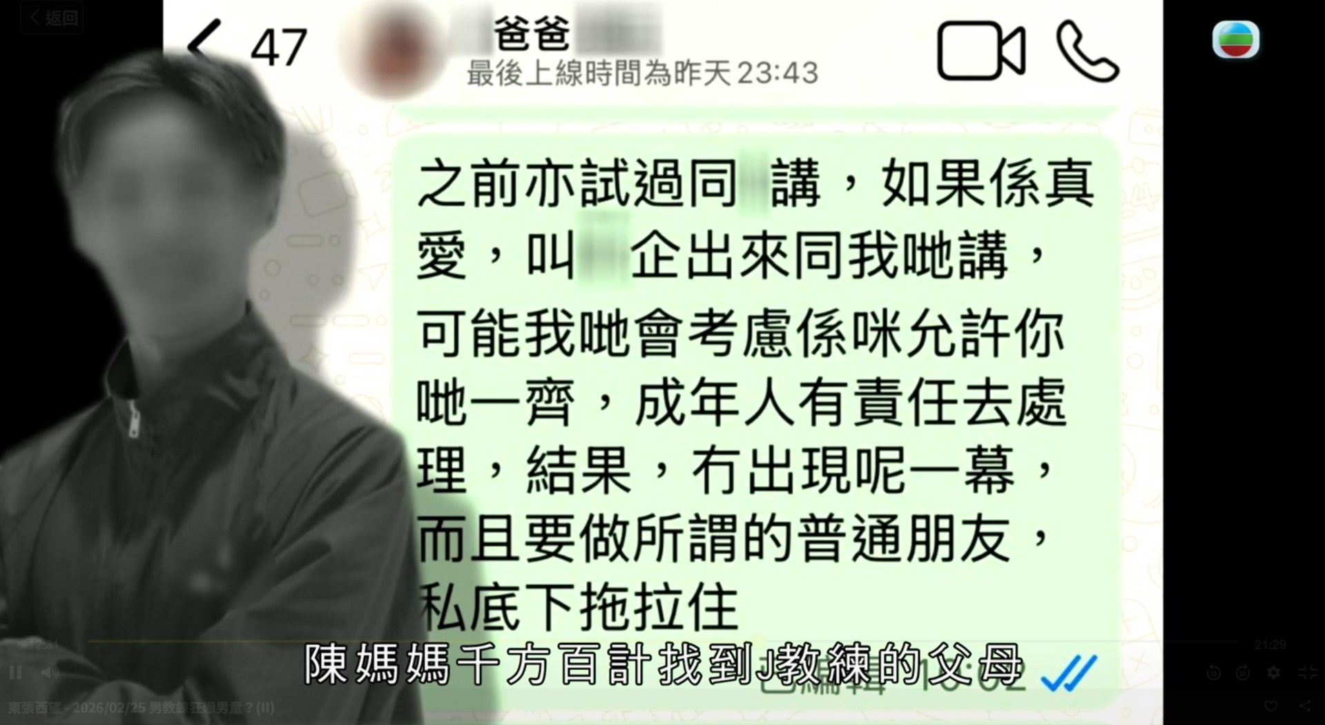 TVB 資訊節目《東張西望》近日接連兩集踢爆一宗令人髮指的疑似戀童及誘騙未成年人案件。一名年僅14歲的男童,疑遭一名24歲的男教練(J教練)誘騙並發生越軌關係。男童母親(陳媽媽)在節目中聲淚俱下地控訴該教練的變態行徑,由初時起疑到親手揭發兒子被誘騙至酒店開房,陳媽媽整個過程備受精神折磨,母子關係更因此瀕臨破裂。公仔箱論壇! Y3 ?: }: ]+ p$ A: c