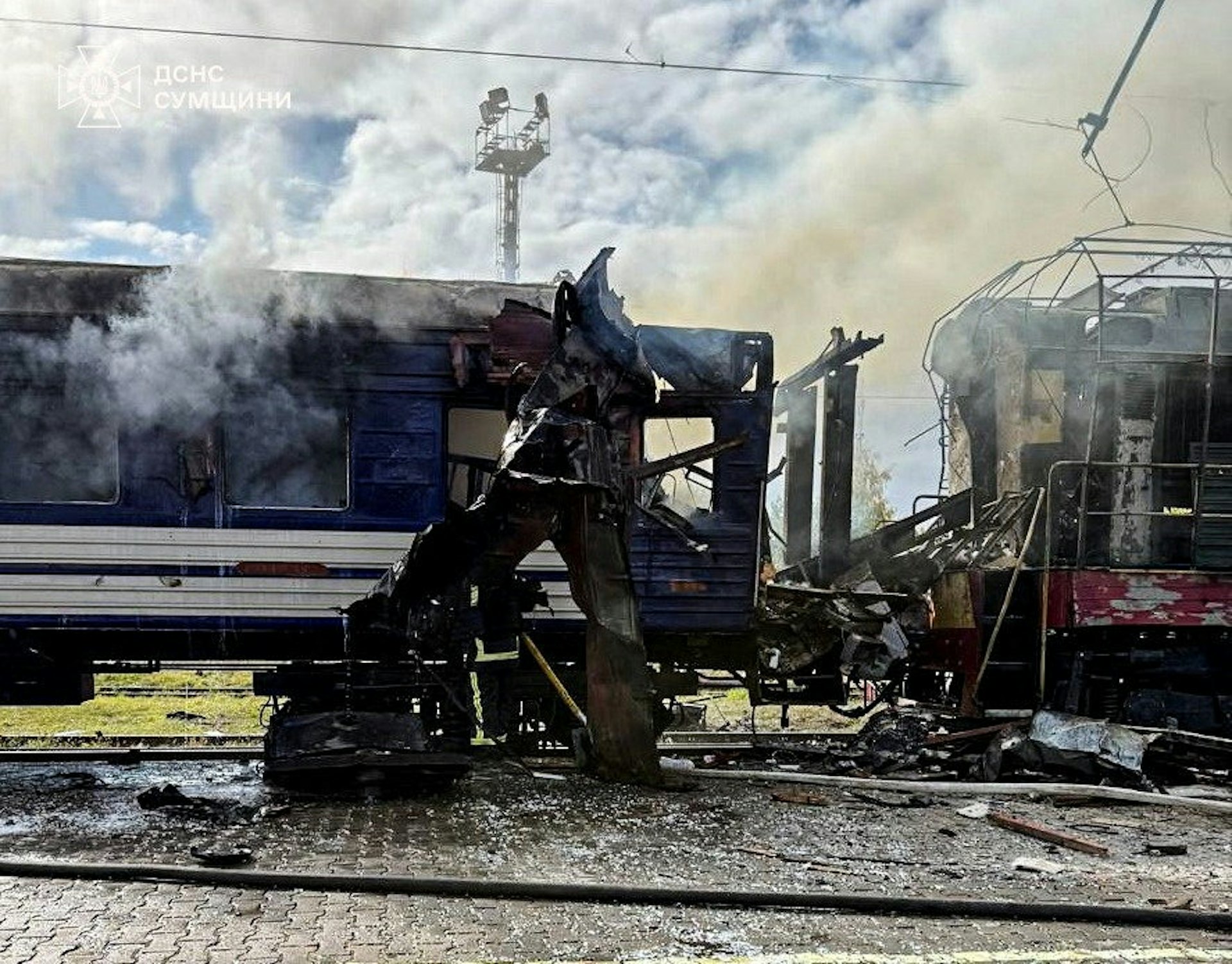 3 i: X3 d( T8 o& twww2.tvboxnow.com2025年10月4日,烏克蘭蘇梅地區紹斯特卡市(Shostka,Sumy)火車站,一列客運火車被俄羅斯無人機擊中後,冒出濃煙。(Reuters)