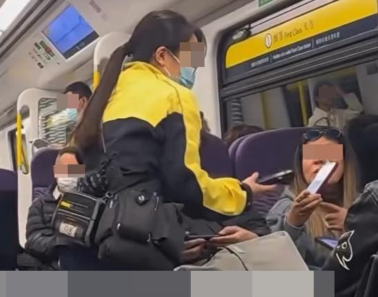 女職員向1名坐在座位的女乘客查問資料,女乘客則出示微信(WeChat)二維碼。(Facebook群組「車cam L(香港群組)」)