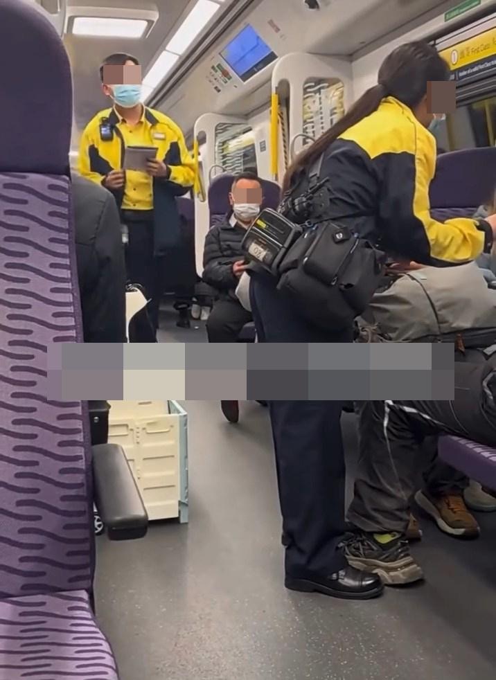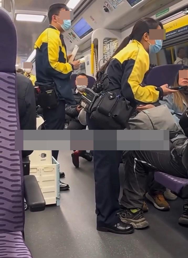 本港網絡流傳影片,指東鐵線頭等車廂內有3名男女乘客沒有付款,被職員查票「斷正」。(Facebook群組「車cam L(香港群組)」)