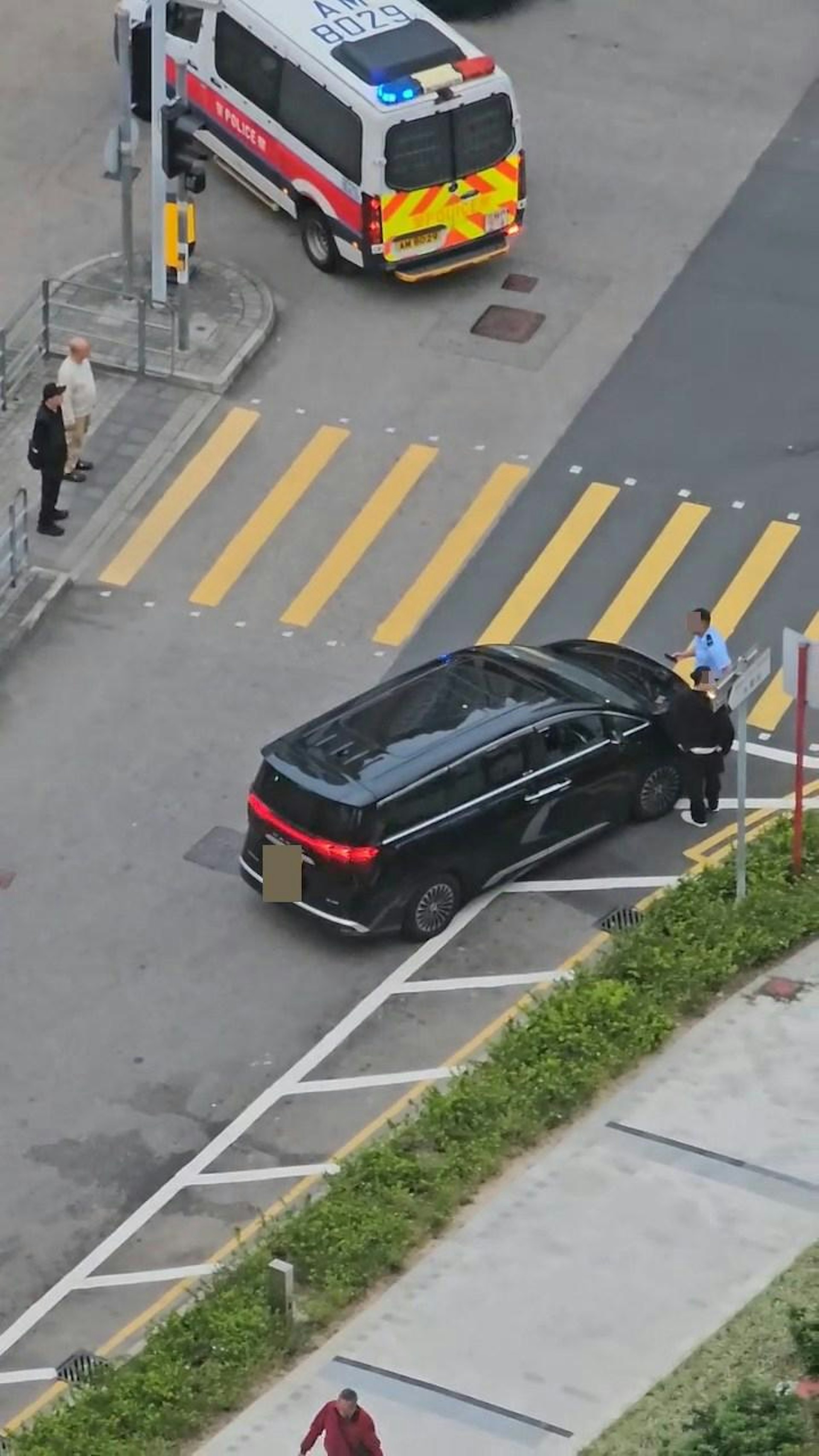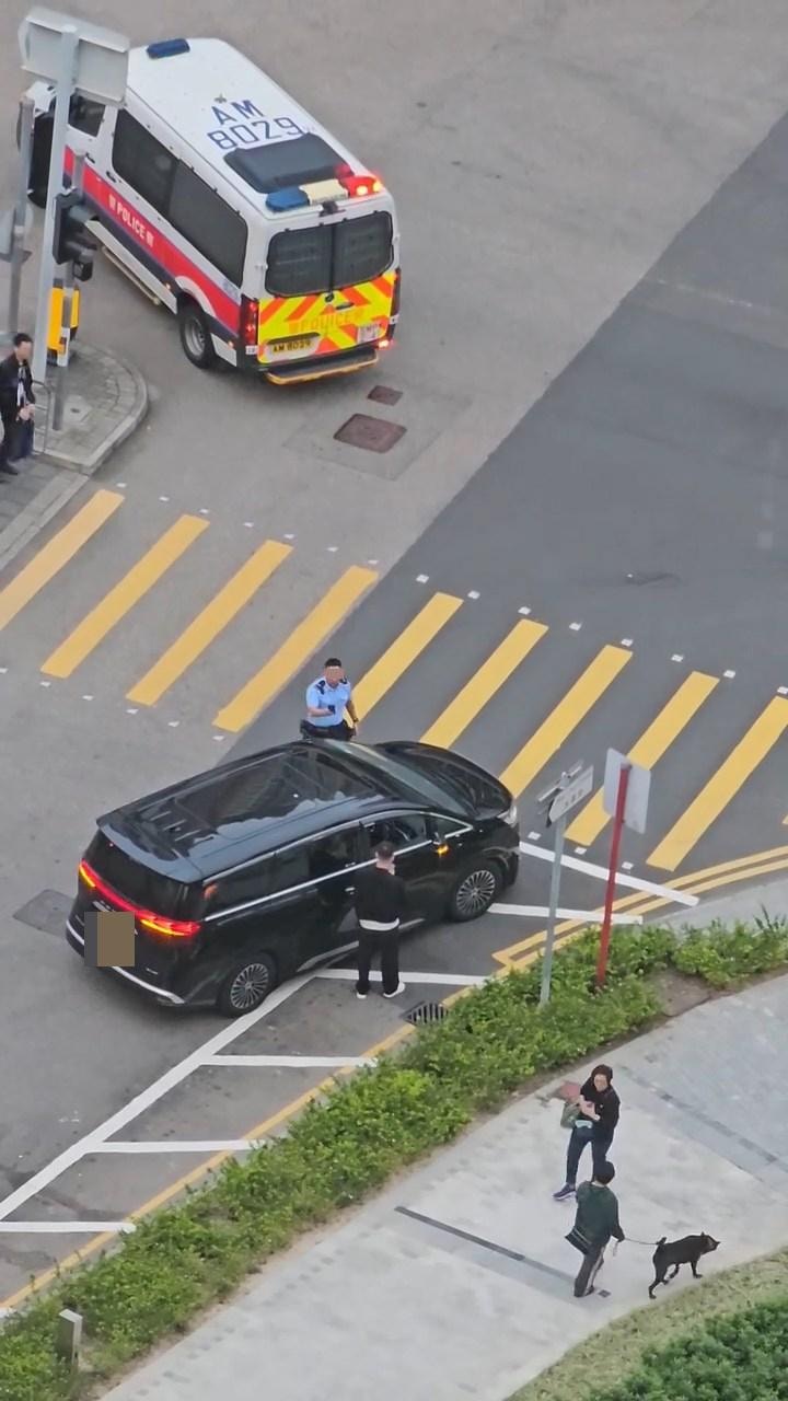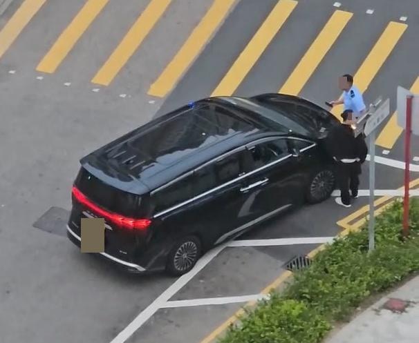 影片從高處拍攝,見到1部掛有中港牌的黑色7人車停泊在斑馬線旁,不遠處有1部警車停泊。而疑似中港牌私家車男司機下車站在司機位旁,有警員登記資料。