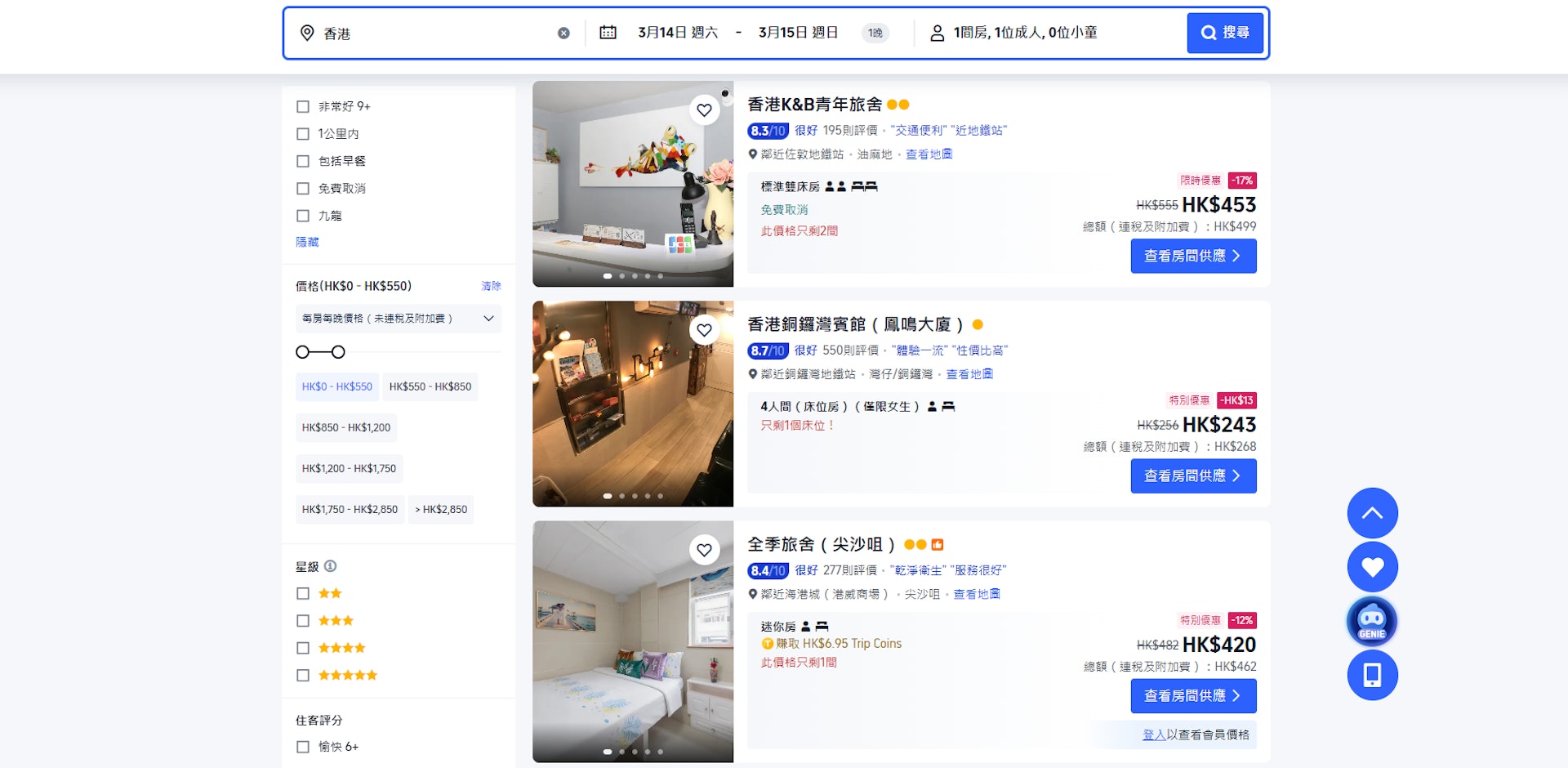 , J* \( }. X" L! f! @若在旅遊服務平台Trip.com,搜尋3月14日至15日的旅館房價,大部份索價約200元至400元。(網頁截圖)