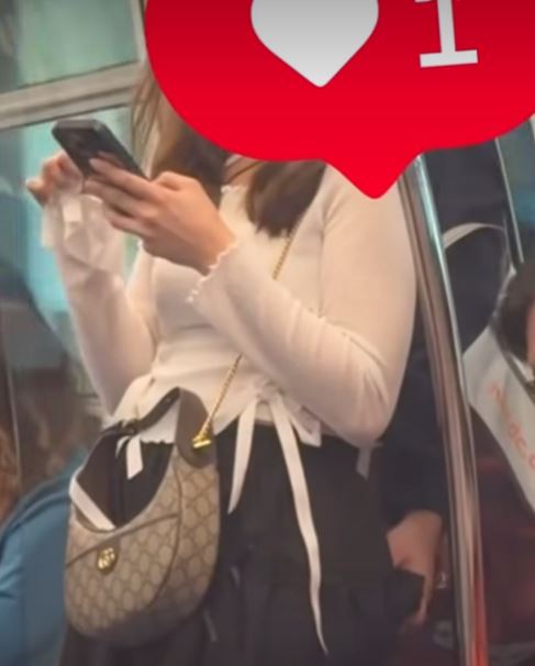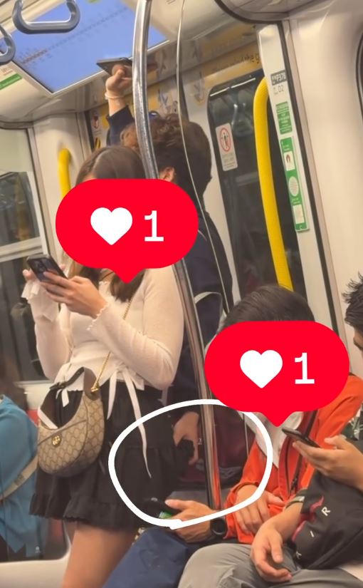 7 g6 ~; ]9 F, j公仔箱論壇男子緊貼短裙女乘客的身後,手執短裙有所動作。Threads影片截圖