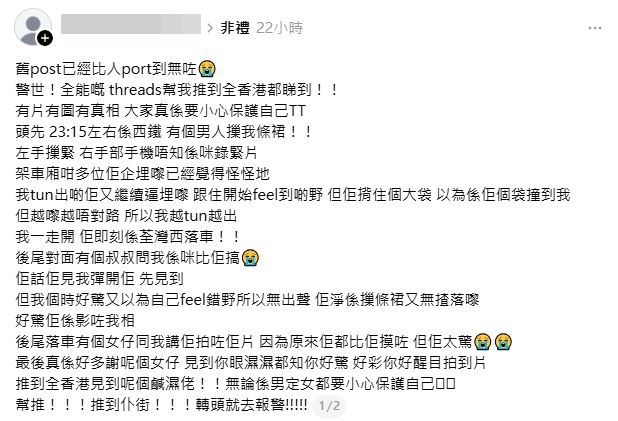 `# z- I, s$ u/ r! m% S公仔箱論壇受害的短裙女事主在社交平台Threads發文講述事件,指在西鐵車廂內「有個男人摷我條裙」。她形容當時車廂內空間甚多並不擠迫,但男子「企埋嚟」,她「已經覺得怪怪地」。她於是站開一點,未料「佢(男子)又繼續逼埋嚟」;她察覺有異,但由於對方「揹住個大袋,以為係佢個袋撞到我」。女事主指自己越站越出,感覺「越嚟越唔對路」,最後自己走開,該名男子隨即於荃灣西站下車。 tvb now,tvbnow,bttvb% h5 U0 f, r, i* x: U% Z