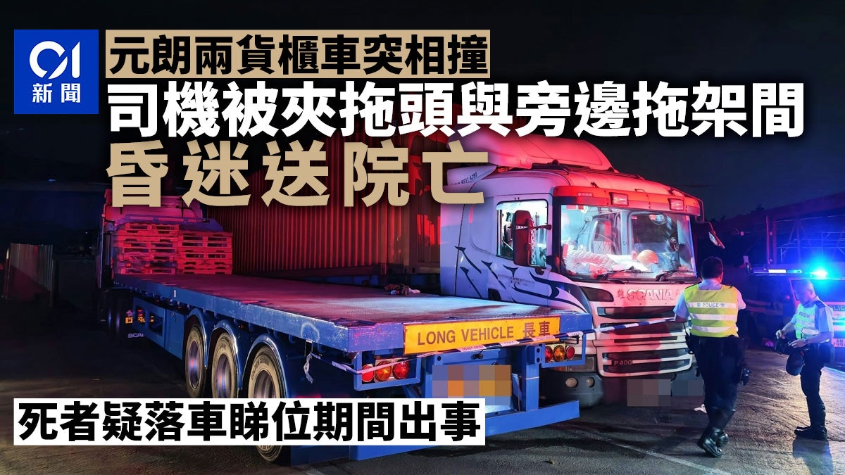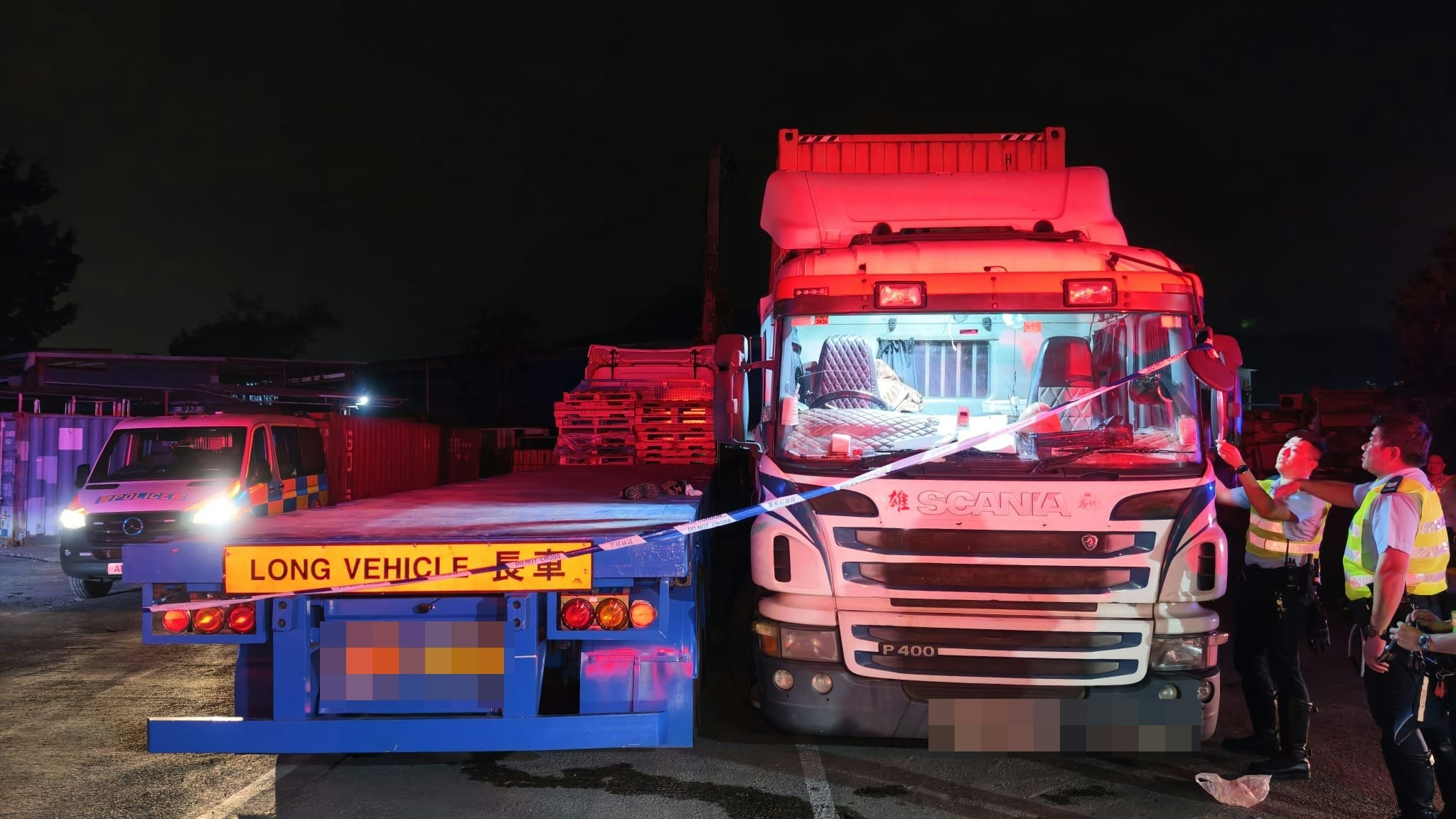 元朗發生嚴重車禍。周二(24日)晚上10時許,據報一輛貨櫃車在田廈路近舊李屋村一個物流貨場,司機疑落車「睇位」期間,突然與旁邊另一輛貨櫃車相撞。姓劉(76歲)男司機,被夾在自己的拖頭司機位的門、與旁邊貨櫃車的拖架之間,昏迷不醒。