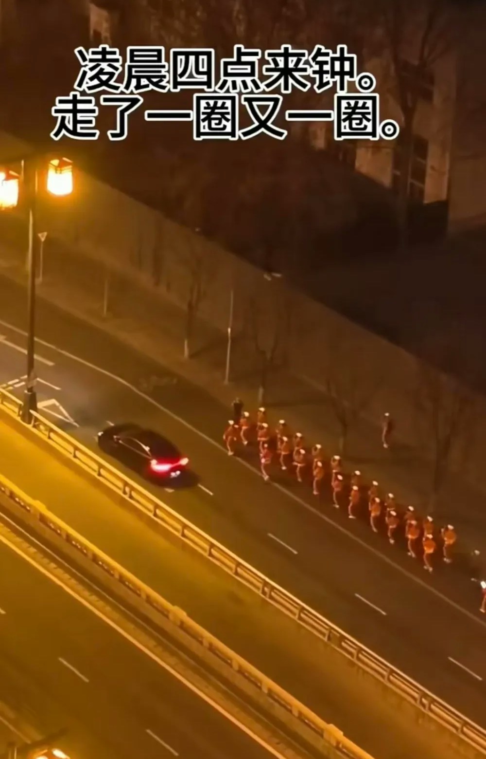 影片顯示,20餘名身穿橙紅色統一服裝的人員在道路上列隊行進,隊伍前方有人攜帶音響播放音樂。周邊居民反映稱:「每天凌晨四點就開始走,音響聲音特別大,我們住附近的根本沒法睡覺。」