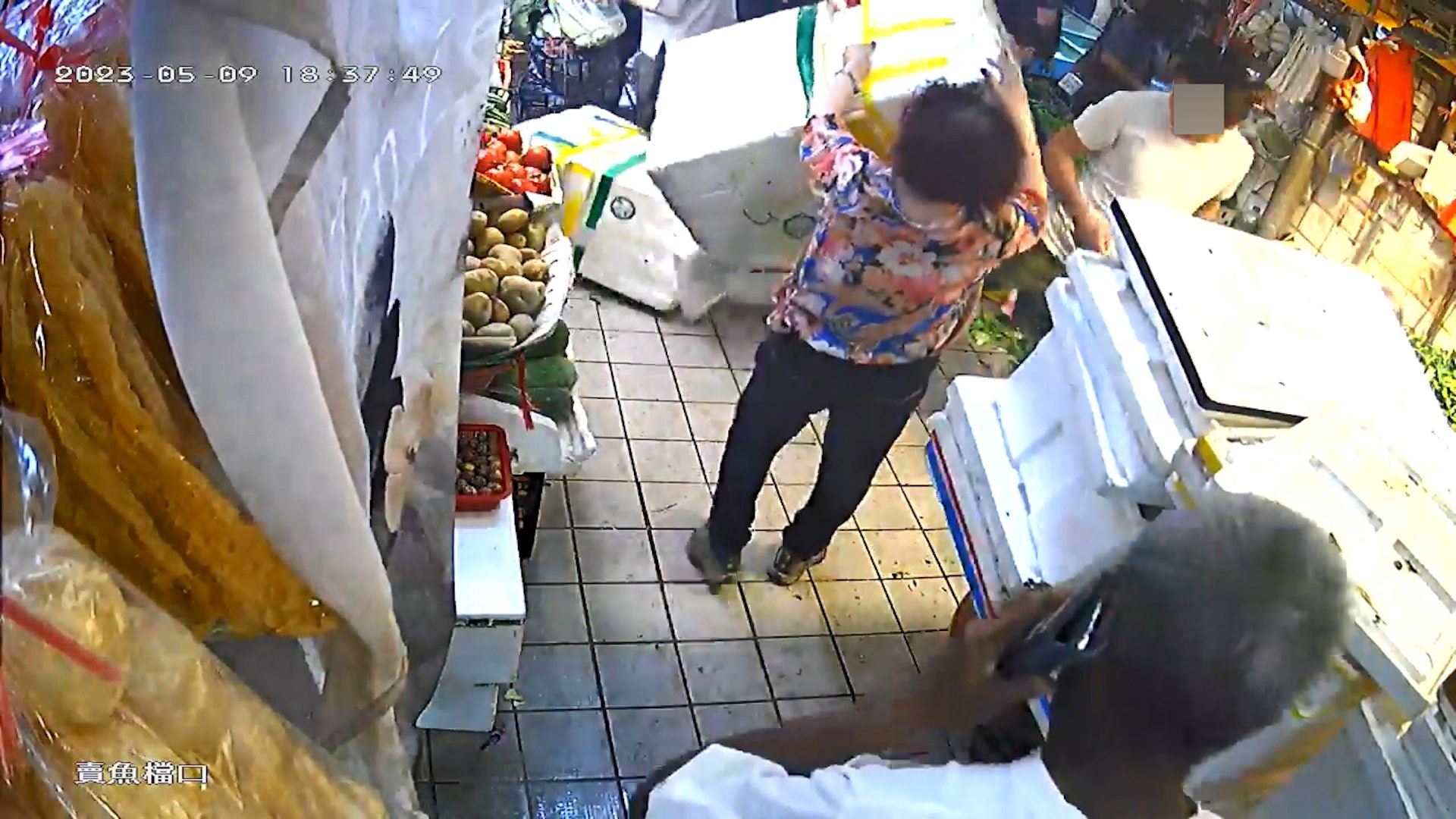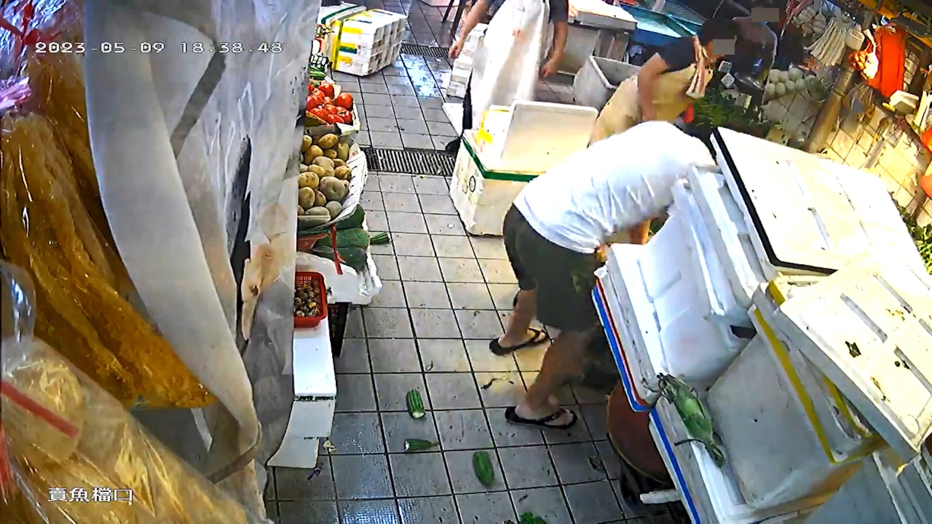 大嬸掉落箱蓋,砸中買菜大叔的腳。(fb群組「香港突發事故報料區及討論區」影片截圖)TVBNOW 含有熱門話題,最新最快電視,軟體,遊戲,電影,動漫及日常生活及興趣交流等資訊。0 d8 ?. v' b2 W