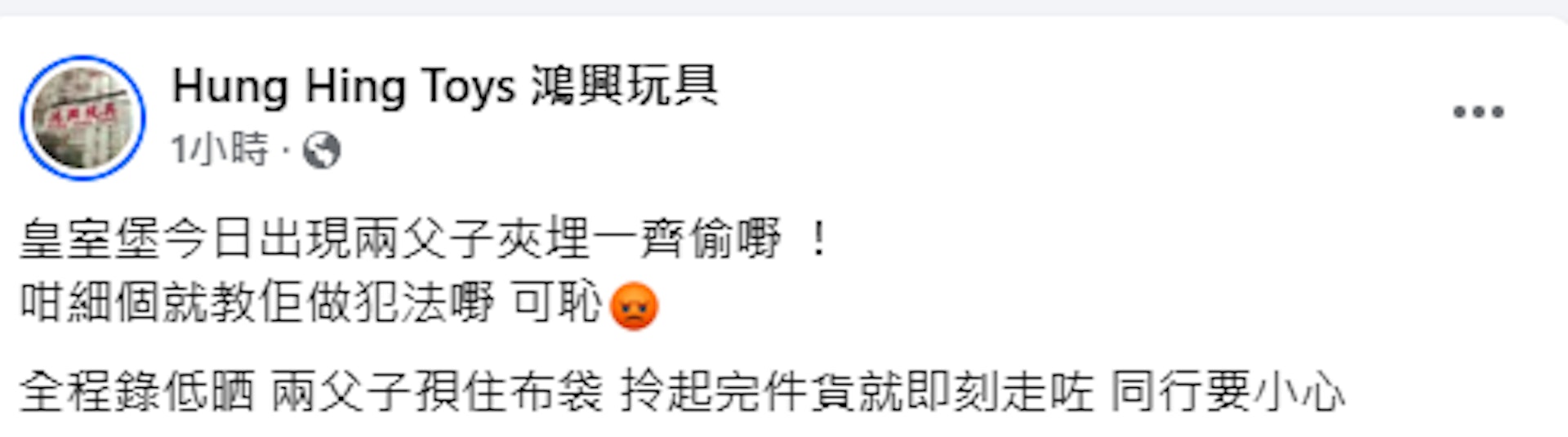銅鑼灣發生店舖盜竊案。今日(5日)下午1時許,一名男子與一名男童,疑在皇室堡「鴻興玩具」,偷走一盒值價約1,000元的模型車。