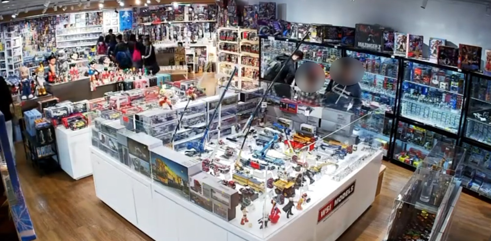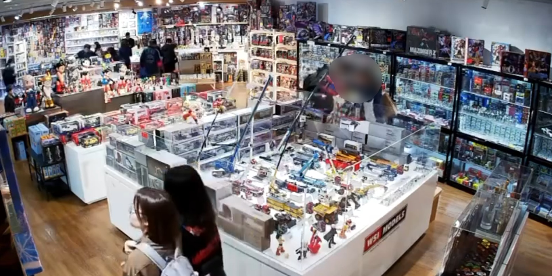 店方在Facebook專頁公開事發時的閉路電視片段,可見男子與攜有一個大購物袋的男童,先在模型陳列櫃旁遊走觀看,其後走到一個紅色盒前駐足交談。約10多秒後男子往右方張望,隨即一手拿起紅色盒子交予男童,他接過後單手抱起盒子,與男子一同揚長而去,其間未見有任何掩飾動作或將盒子藏起。www2.tvboxnow.com+ |' y6 C; K# B9 r, |# i