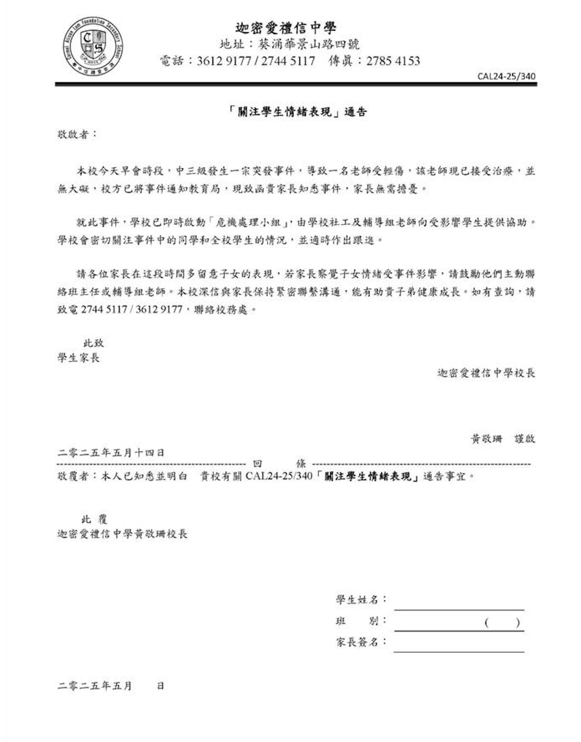 - g' U7 @" y, `2 a- v$ K$ {學校昨日發出一封題為「關注學生情緒表現」的電子通告向家長交代事件。(家長提供圖片)公仔箱論壇1 q- @% n' e$ z