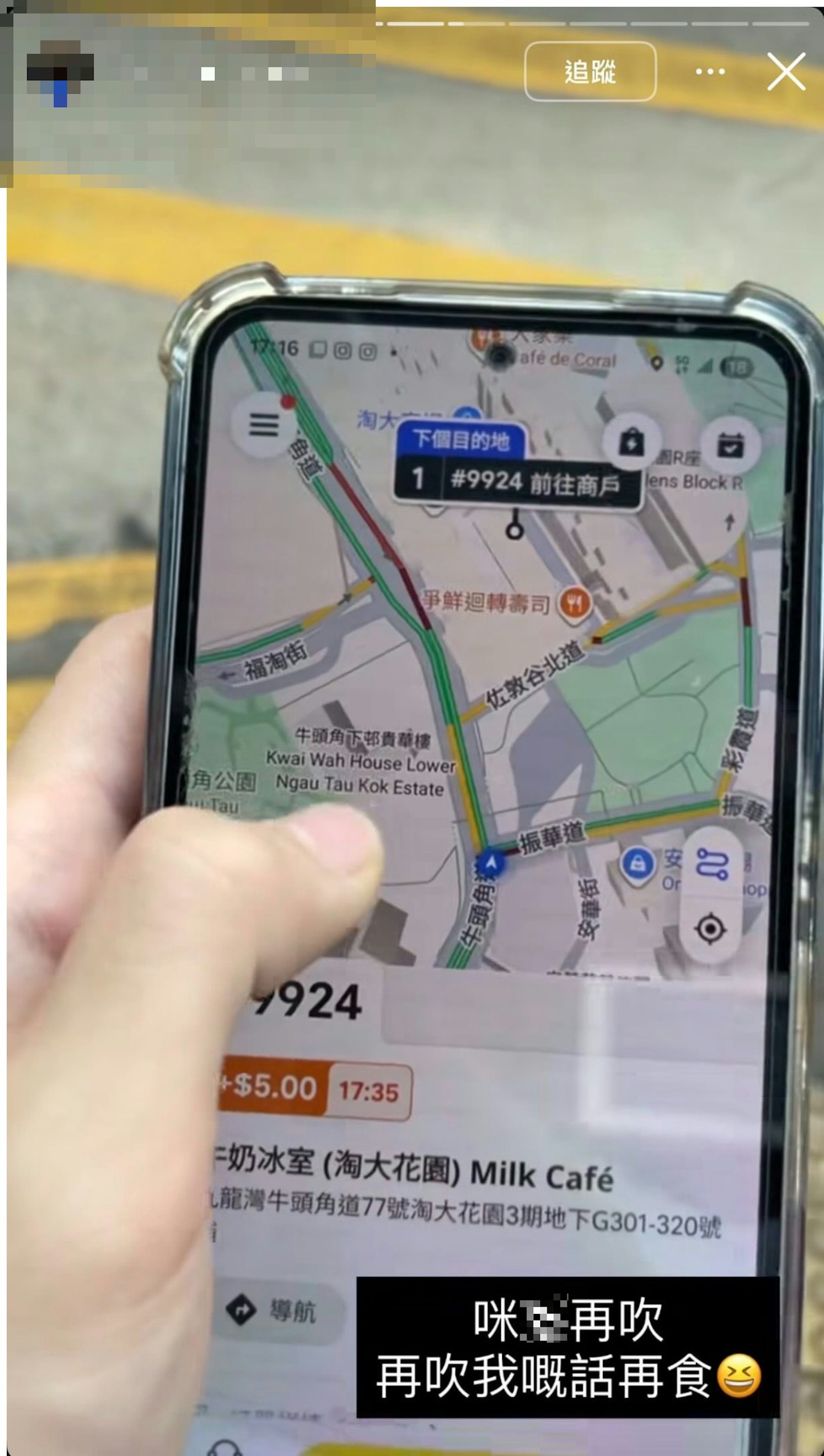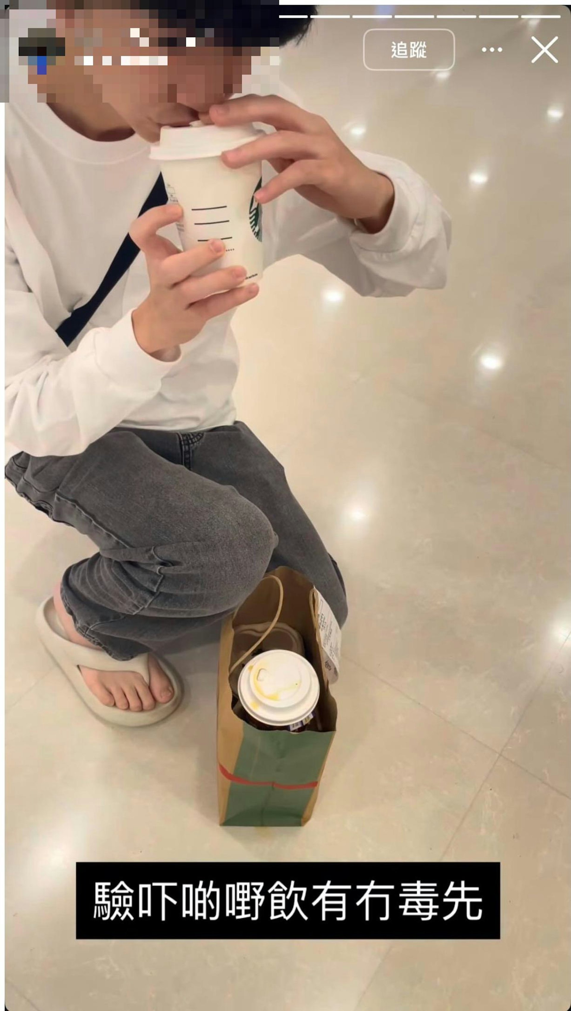 8 f, M: ?2 I3 V" ]3 i( c帖文附上多張由涉事外賣青年上傳的Instagram限時動態截圖,可見他身穿白衣,正飲用以外賣袋盛載、印有字樣的杯裝飲品。(Threads截圖)
