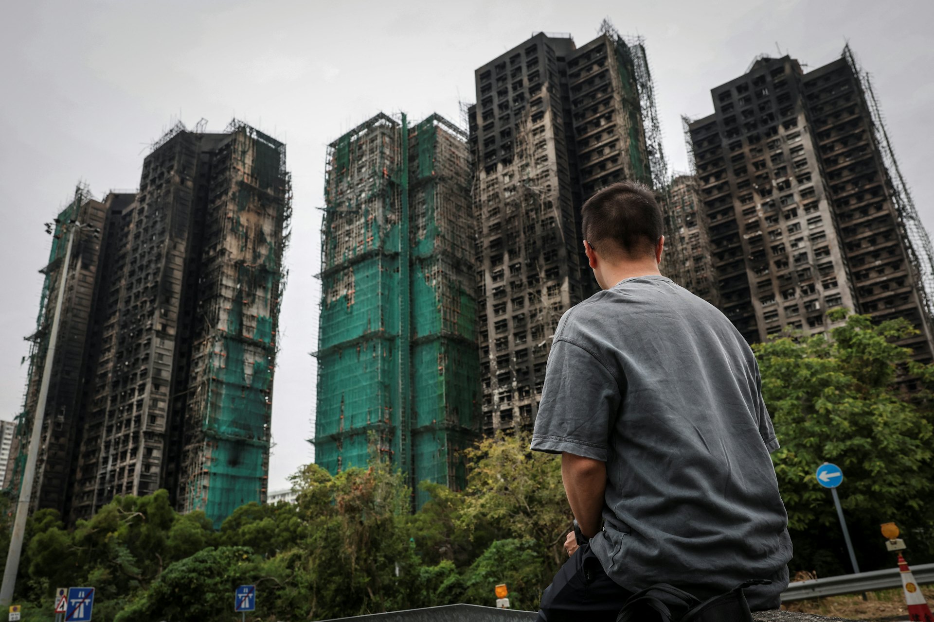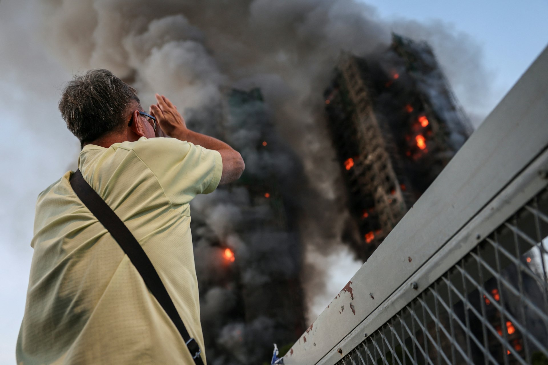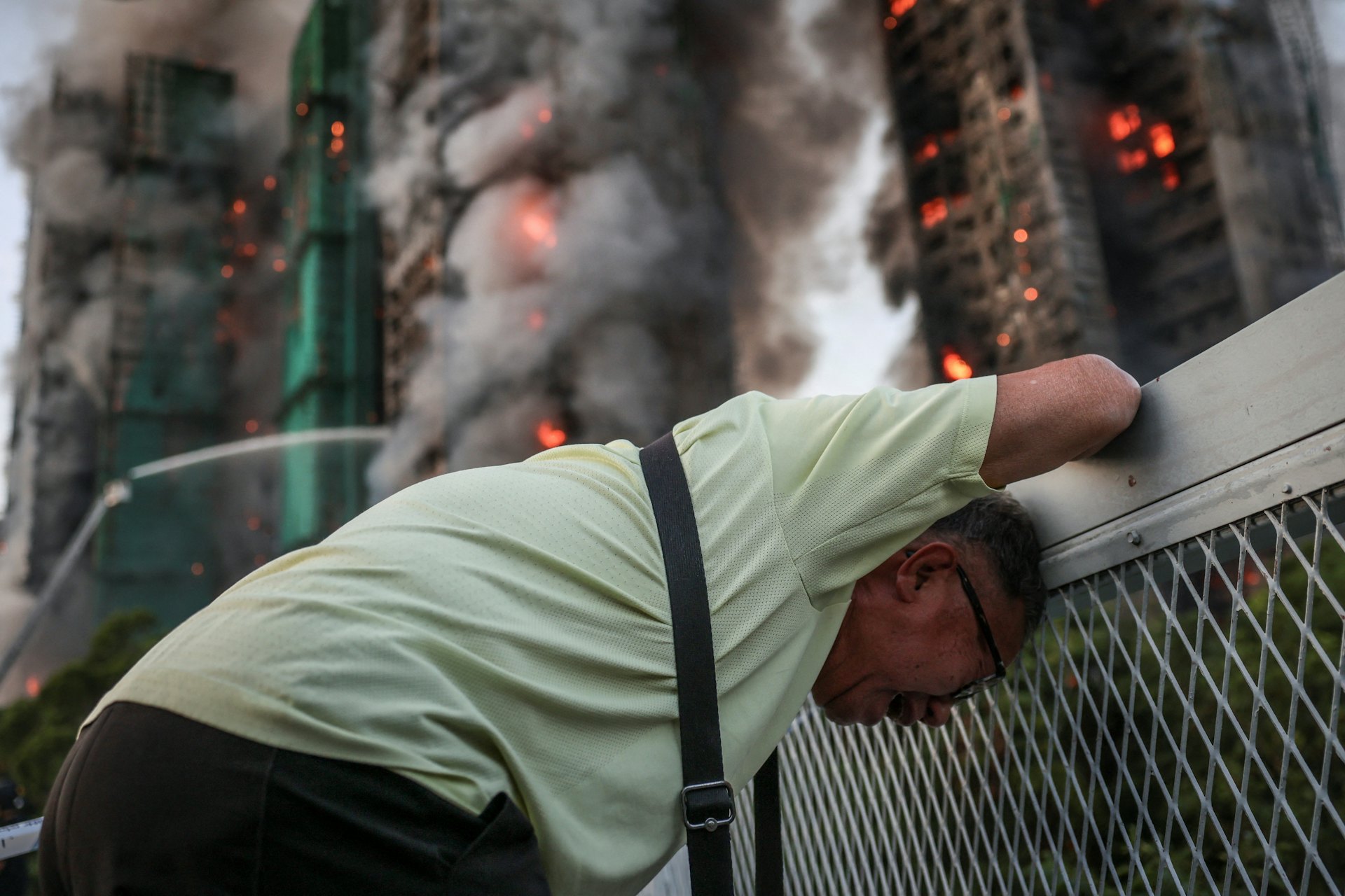 71歲的黃先生在宏福苑大火期間,因妻子被困情緒激動。(Tyrone Siu/路透社)tvb now,tvbnow,bttvb1 X; T! D' P, g% Q; N0 X( t