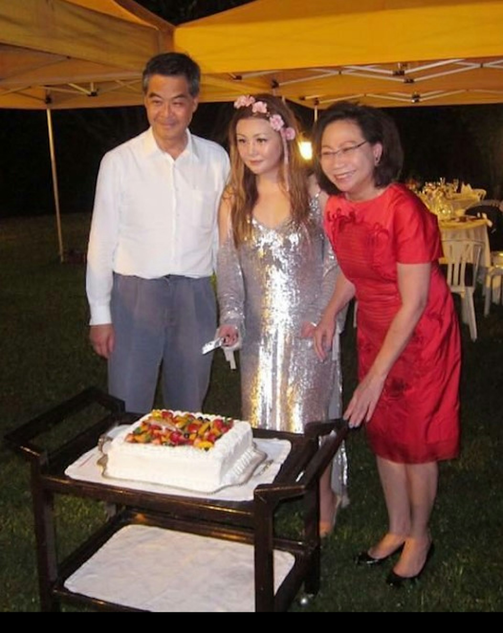 % K) x E* ?1 P' X, o8 F4 Zwww2.tvboxnow.com梁齊昕生日時與父母合照。左為其父親、前特首梁振英。(IG圖片)