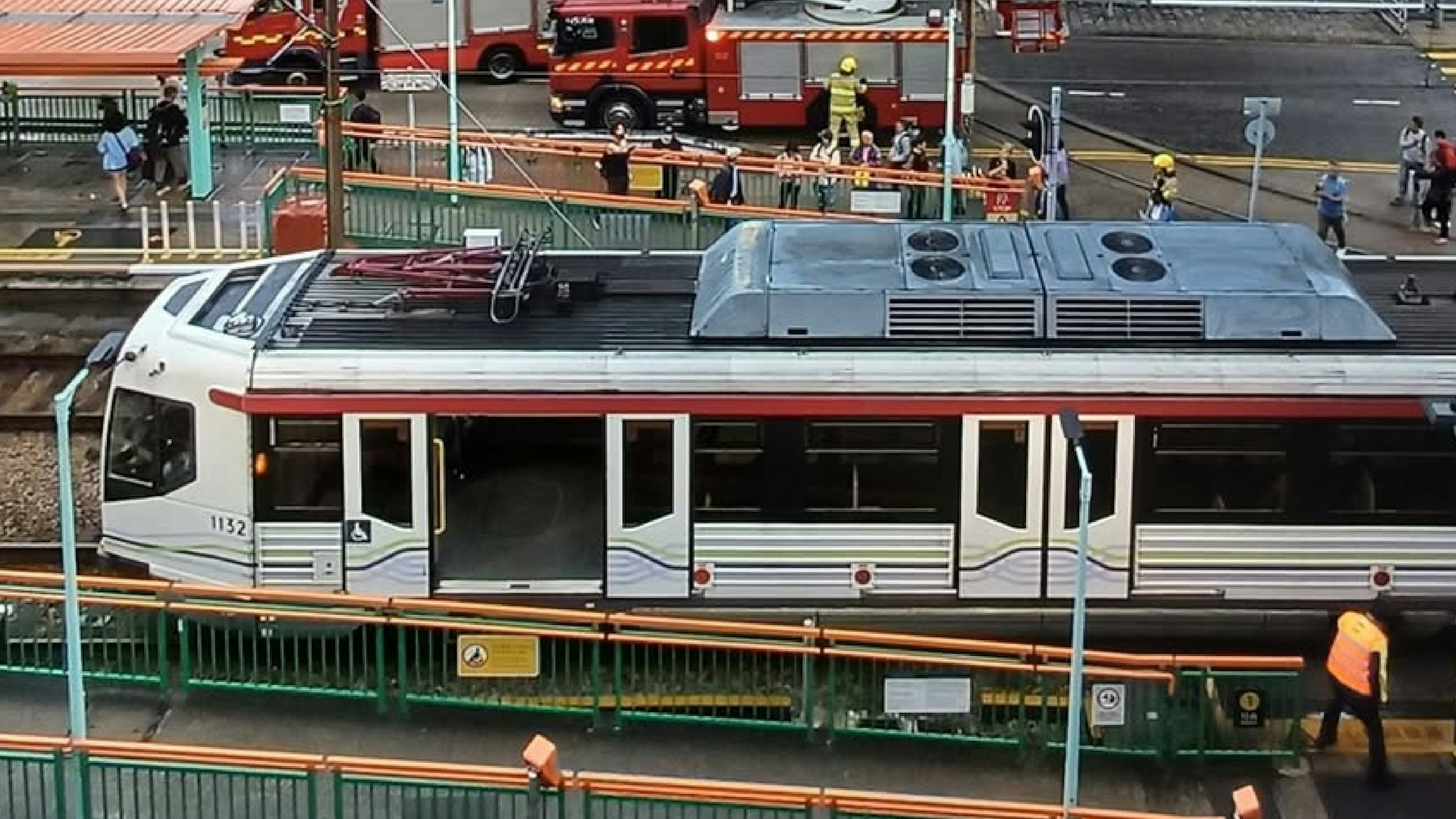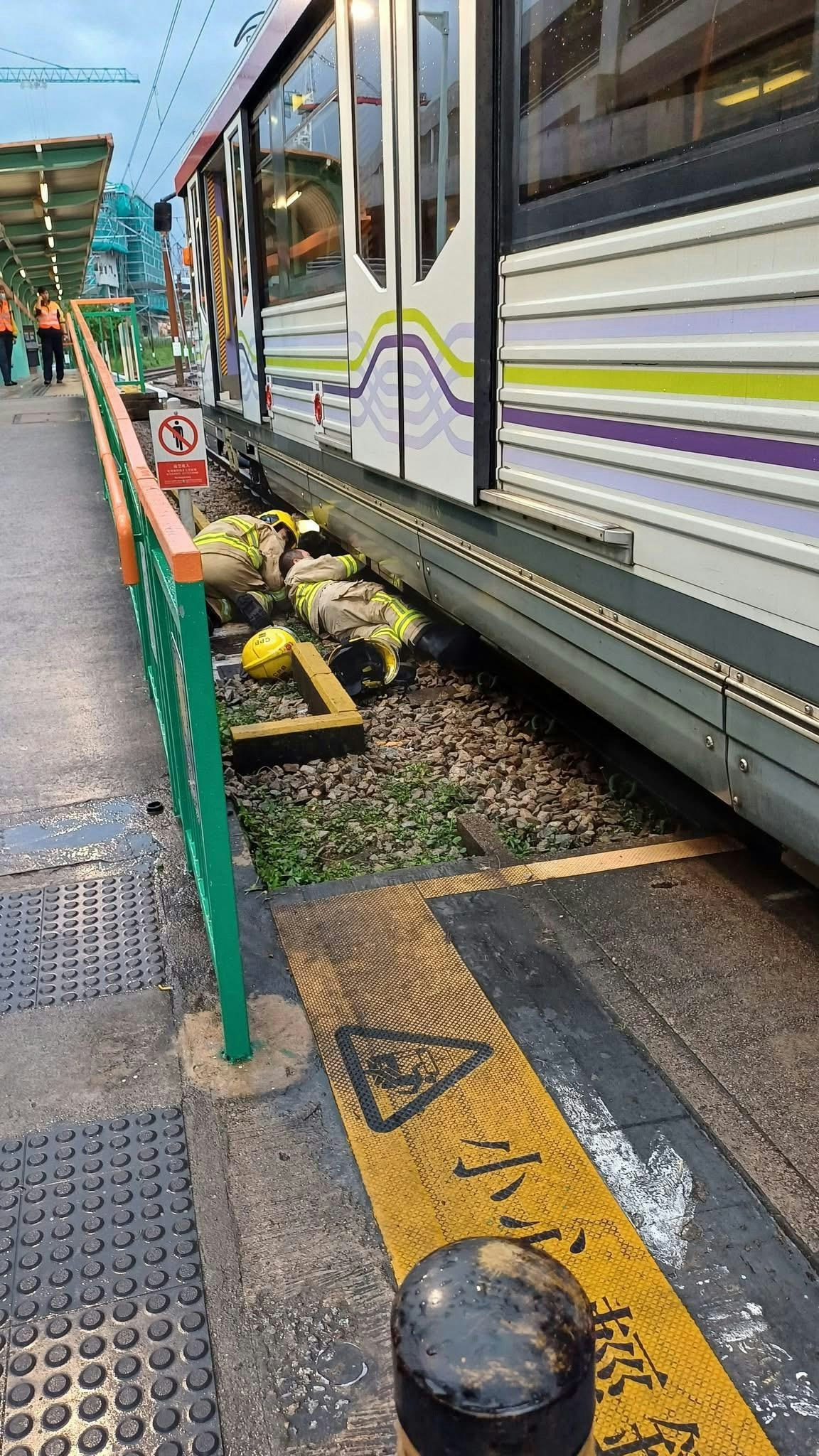 一名途人遭一輛由屯門往元朗方向的輕鐵列車撞倒,傷者被困車底。(Facebook 屯門公路塞車關注組Adolf Cheung )) p& [' M1 ^( I