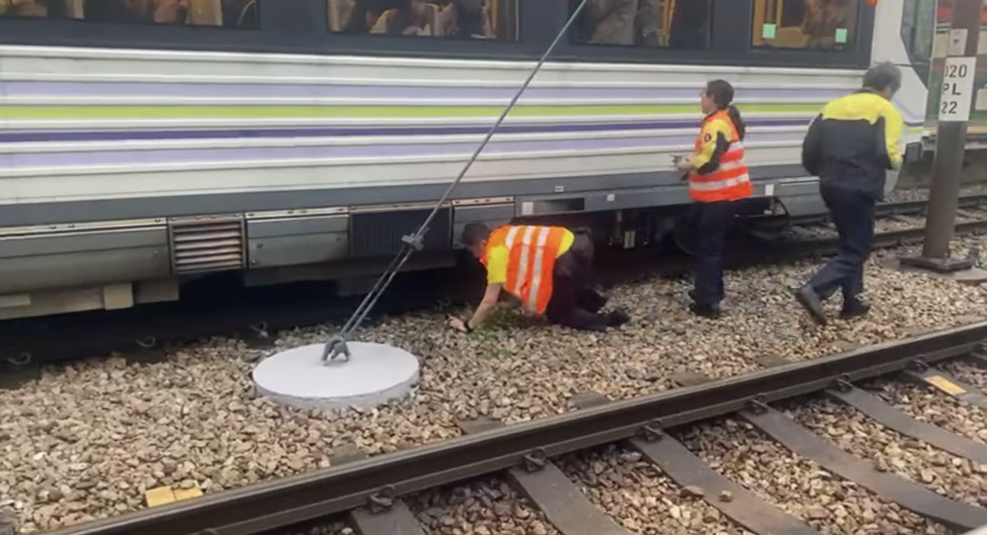 港鐵職員跪地,檢查車底。(Facebook 輕鐵迷俱樂部 · Chan Daniel )