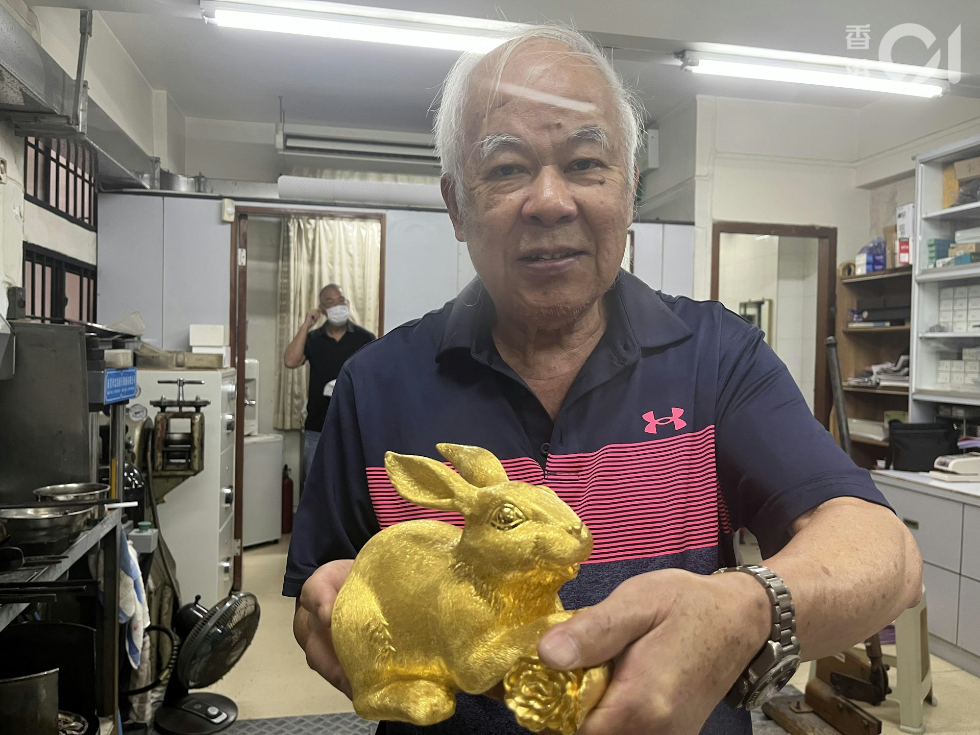 中環「忠記」老闆鍾先生表示,這兩日「忠記」每日都收了數千萬元的黃金,至於最大的一件是一隻重達三公斤的金兔,價值200多萬。(林遠航攝)